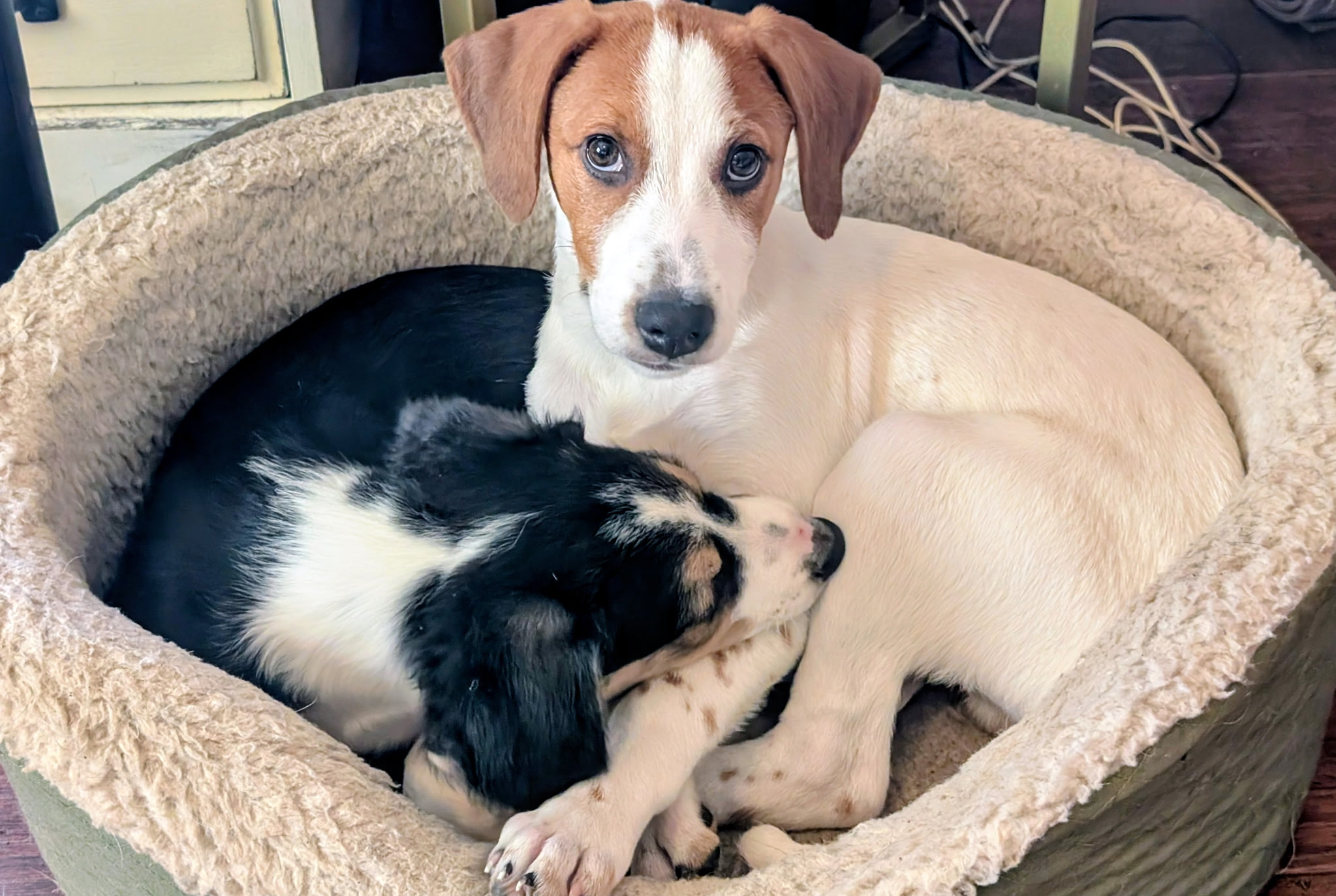 Gracie & Milo are sweet, loving, affectionate, cuddly and we would both be wonderful companions & additions to your family. We’re siblings, born approximately on 6-30-25 and our mom is a beagle. We’re not sure about our dad, but we are lean, with long legs so we might be bigger than your average beagle. Gracie is super soft, medium length fur, black/brown/white and Milo has short, bristly soft fur, brown/white with an adorable curly tail. We love to play together very well, have lots of energy and we’re all puppy!