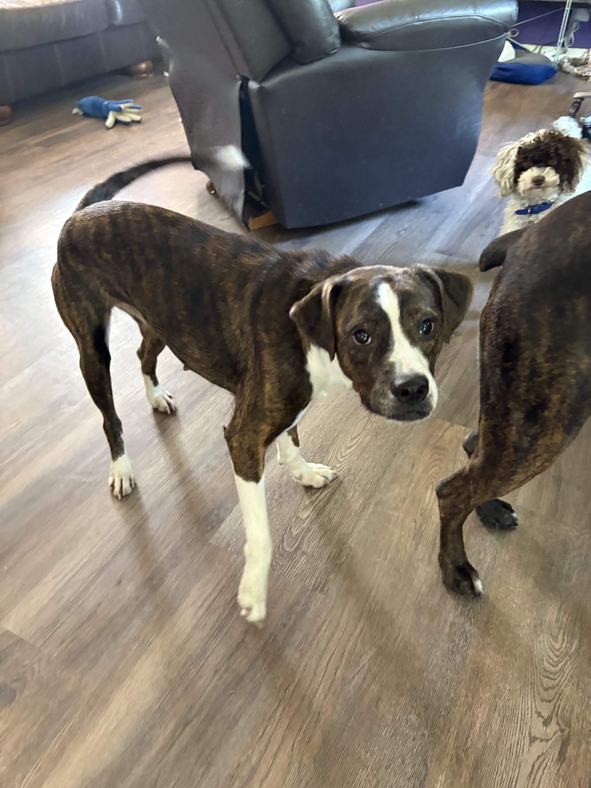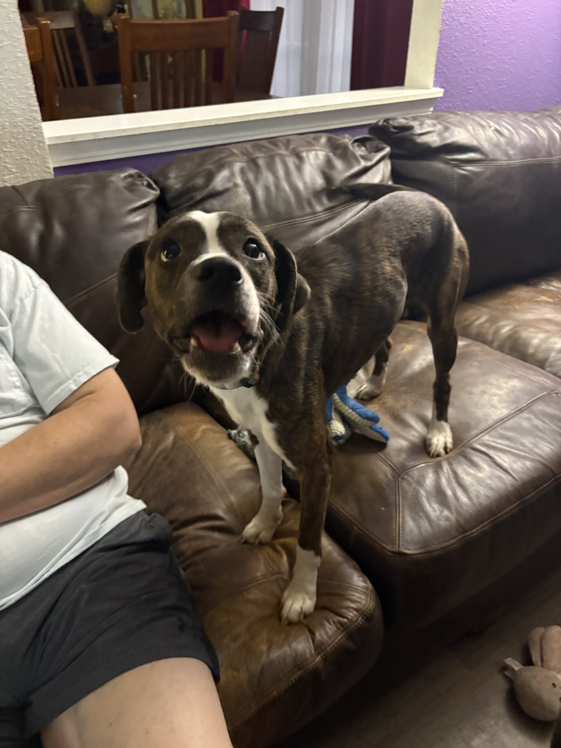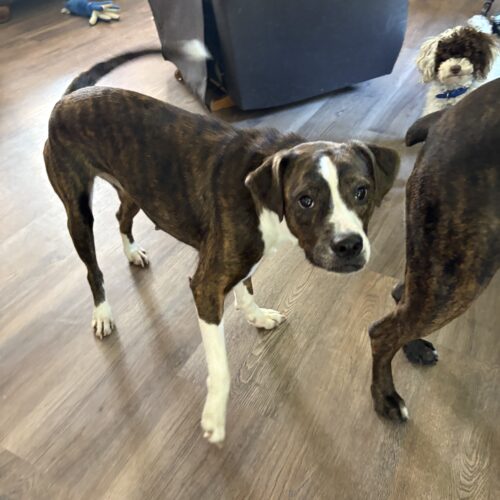 Hi, I'm Myrple (rhymes with purple). I am a sweet fun loving girl who ended up in a shelter after being picked up as a stray.  Now I'm looking for my forever home. I'm a beautiful girl who loves other dogs and does well with cats too.  I love people of all ages but am a little over exuberant sometimes so toddlers might not be a great idea. .  My breed mix is anyone's guess, but they're calling me a boxer beagle mix. I'm around a three years old and weigh about 35 pounds.  I'm crate trained and housebroken. I'm also spayed, microchipped, current on my shots, and HW negative. If you're interested in meeting me please fill out an application and my friends with ARPO will be in touch!