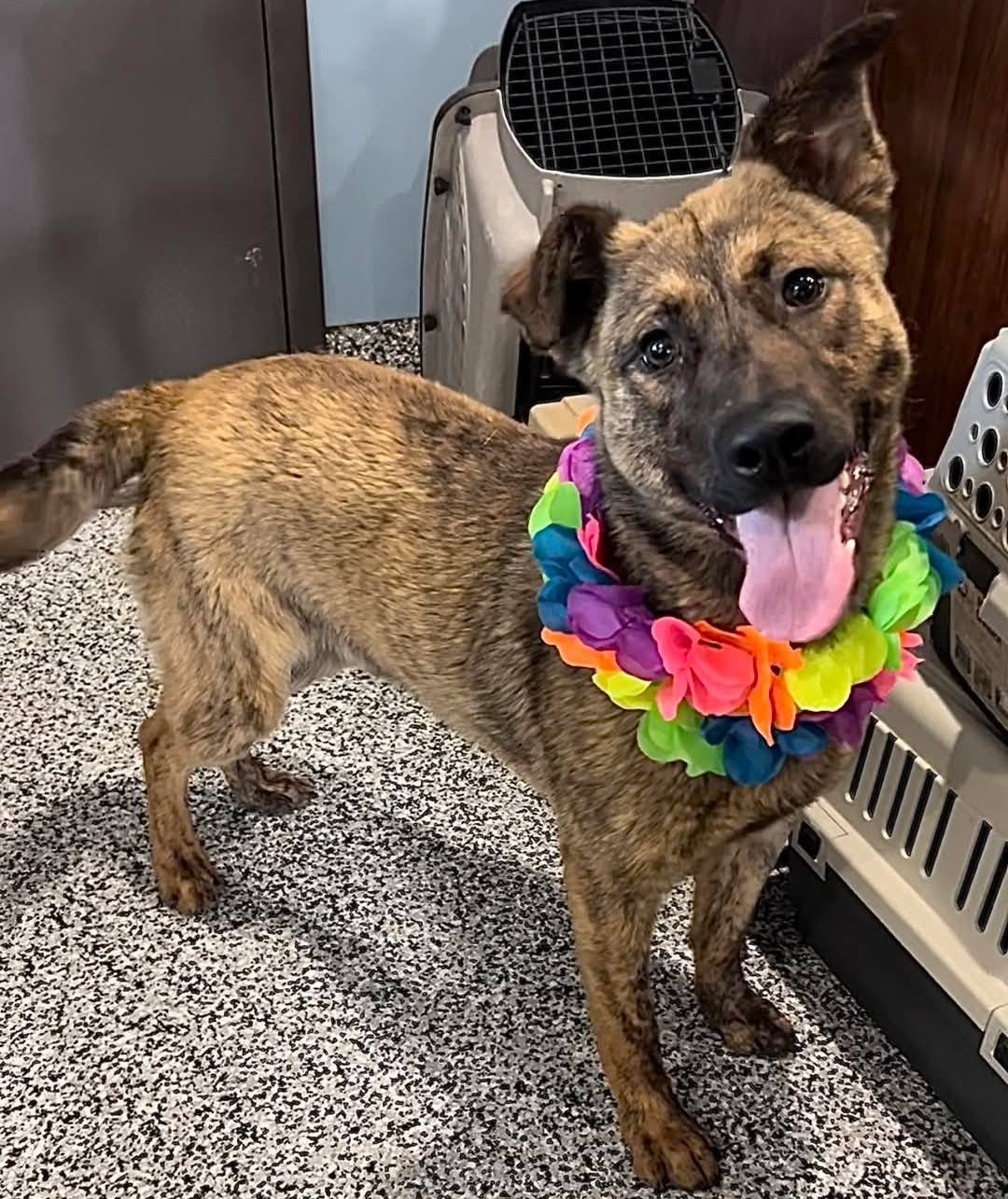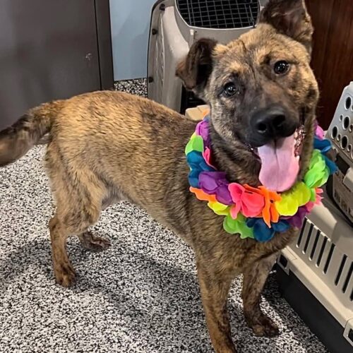 Stark is a striking young pup with a sleek brindle coat, soulful eyes, and expressive ears that flop just enough to charm everyone he meets. Thought to be a Dutch Shepherd mix (possibly with Plott Hound or Boxer), Stark is the total package: smart, strong, and absolutely adorable.