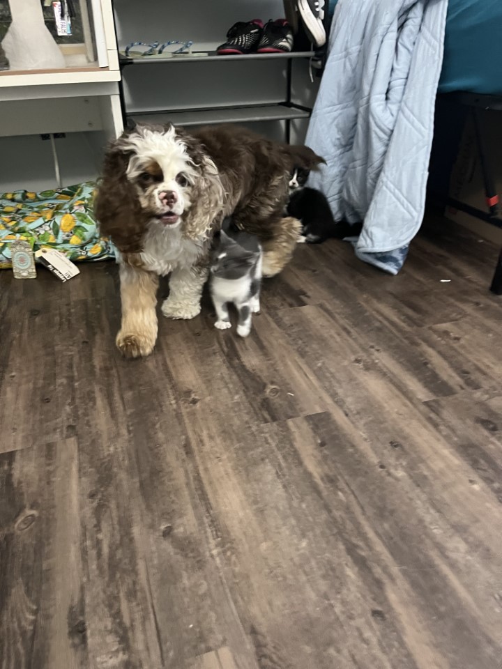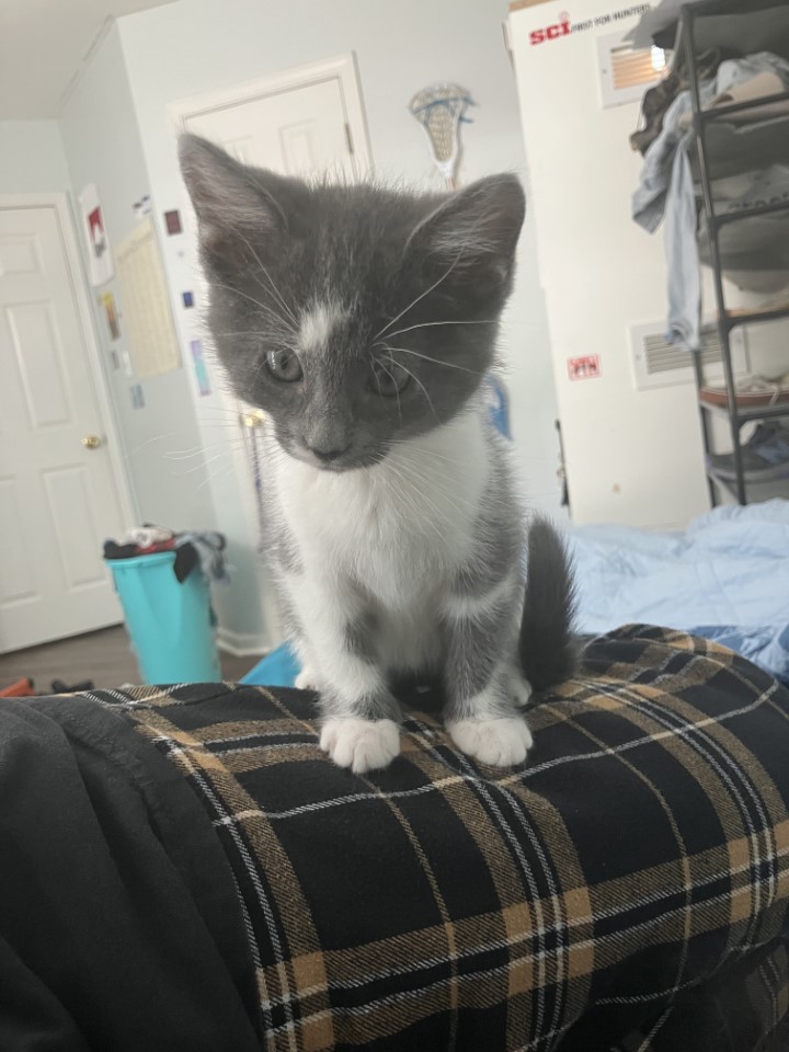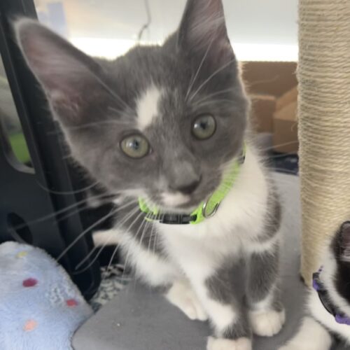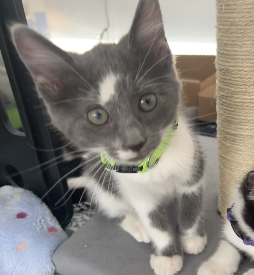 Hi I am Ambrosia. I am one of the female kittens in the group of 5 kittens from the Apple Litter. We were born on 7/17/25. My siblings and I were found in a crawls space. For the first few days, my foster mom said that I was my siblings' protector, until they got acclimated to people. I am the most outgoing of the bunch. I love attention and cuddles from humans. I get along great with my siblings. I rub up against the resident dog in my foster home, any chance that I get. My foster mom says that I have perfect litterbox manners. I also only scratch on my scratching post.