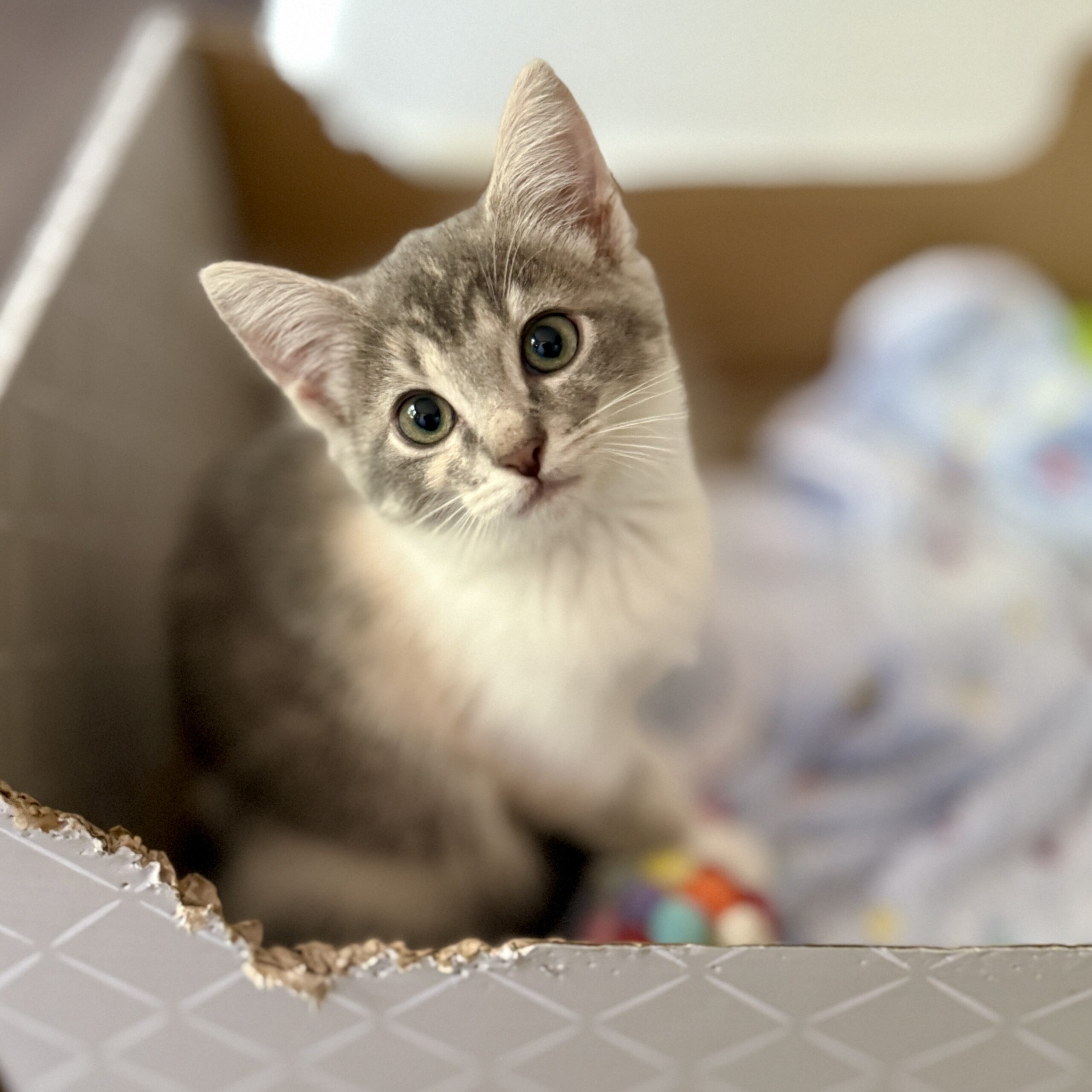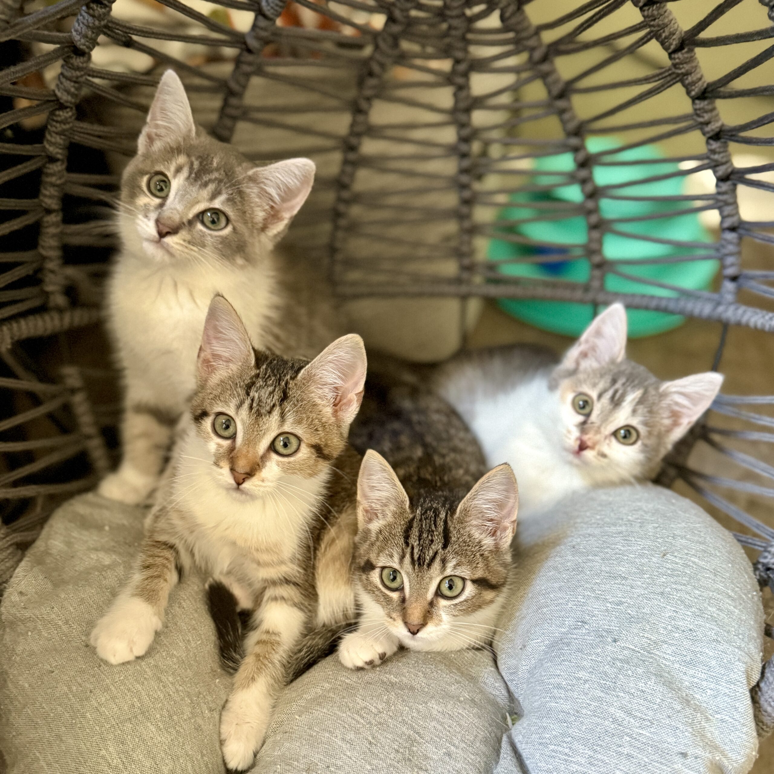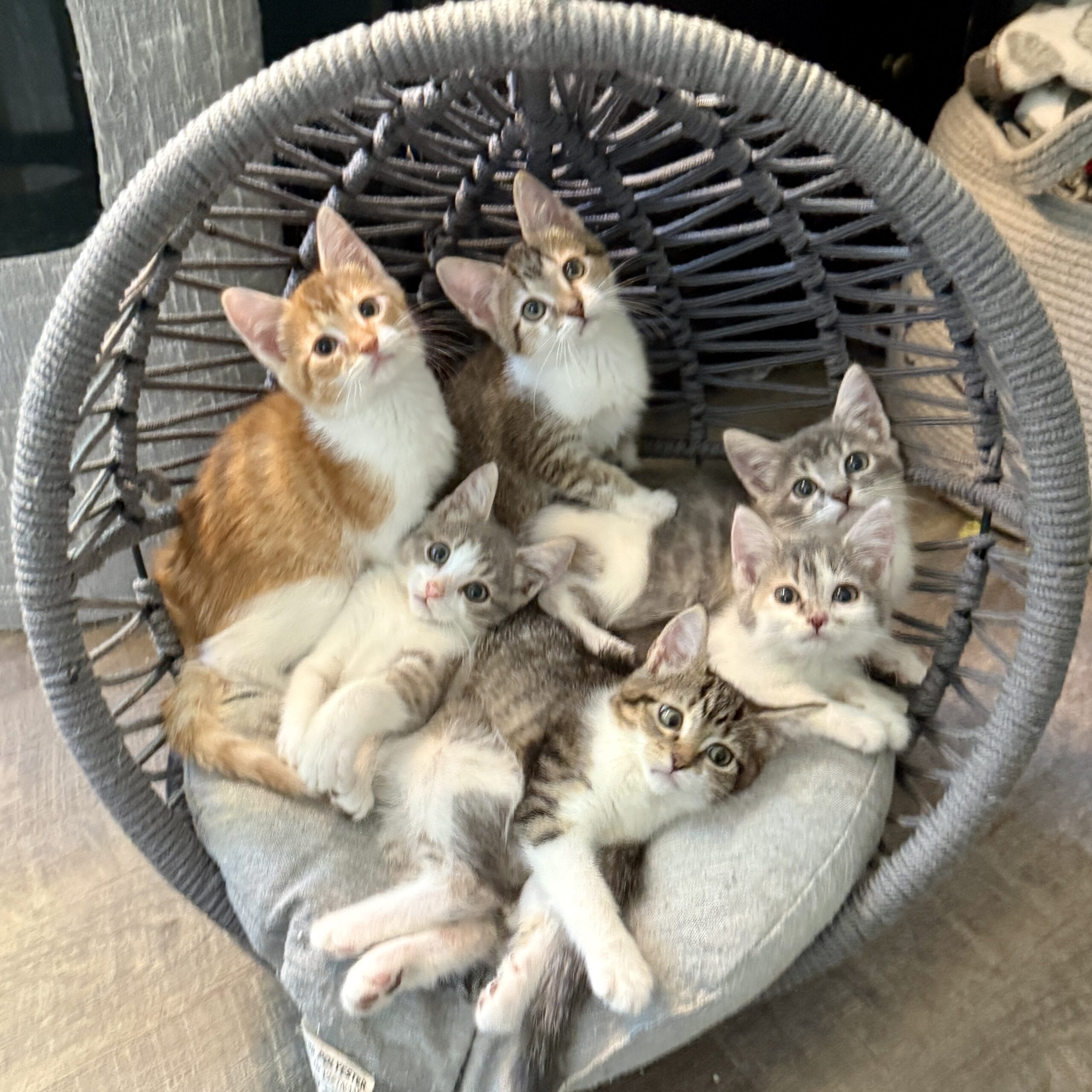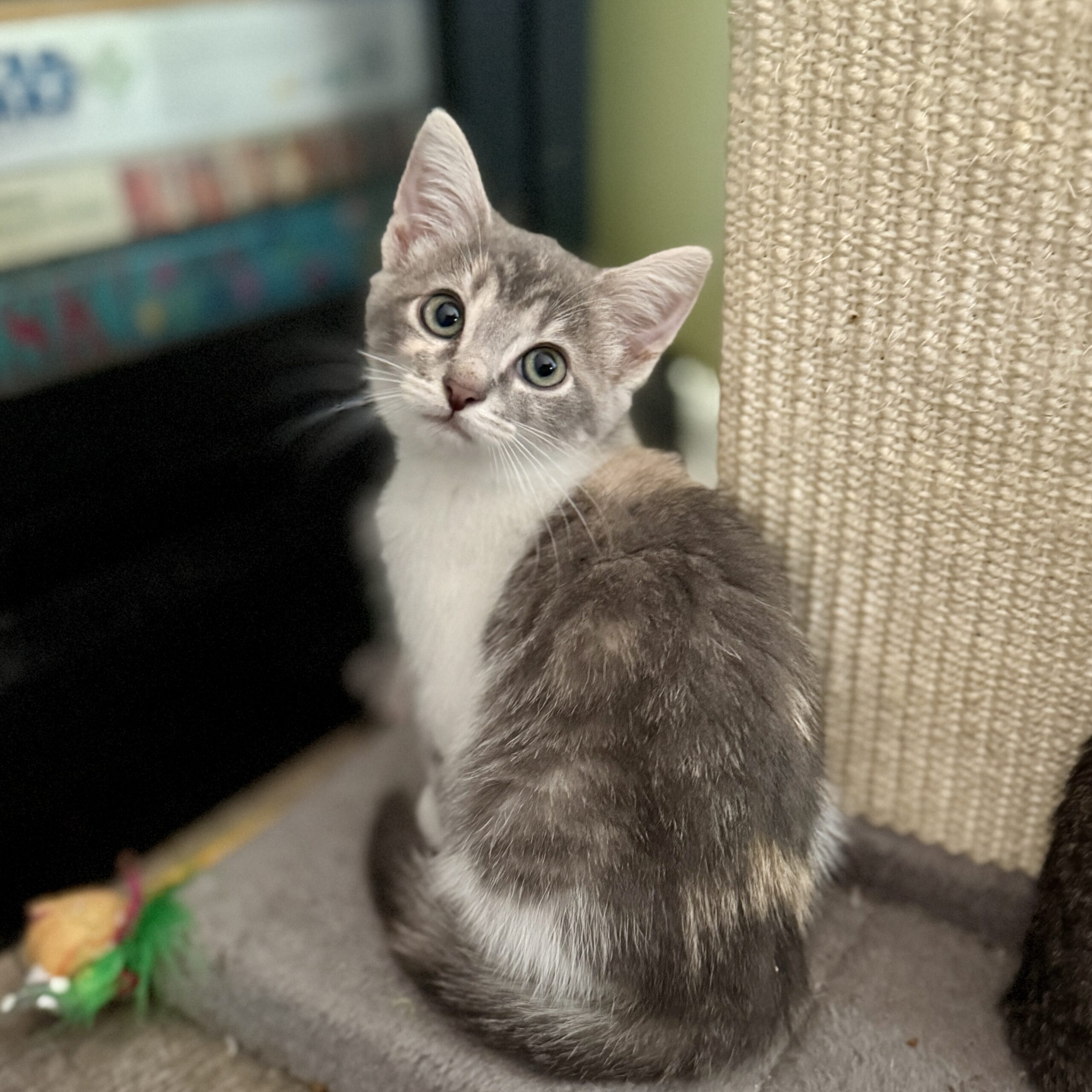Bellini—lovingly called Bellie—is as sweet and refreshing as her namesake cocktail. This beautiful dilute calico has a playful sparkle, chasing toys and romping with her sisters, but also shows her softer side when it’s time for snuggles. A touch more independent than the rest of the “cocktail litter,” she still shines brightest when she’s with her siblings. Bellini may take 24-48 hours to warm up to new people to show her sweet and social / life of the party side her foster mom sees on a daily basis.