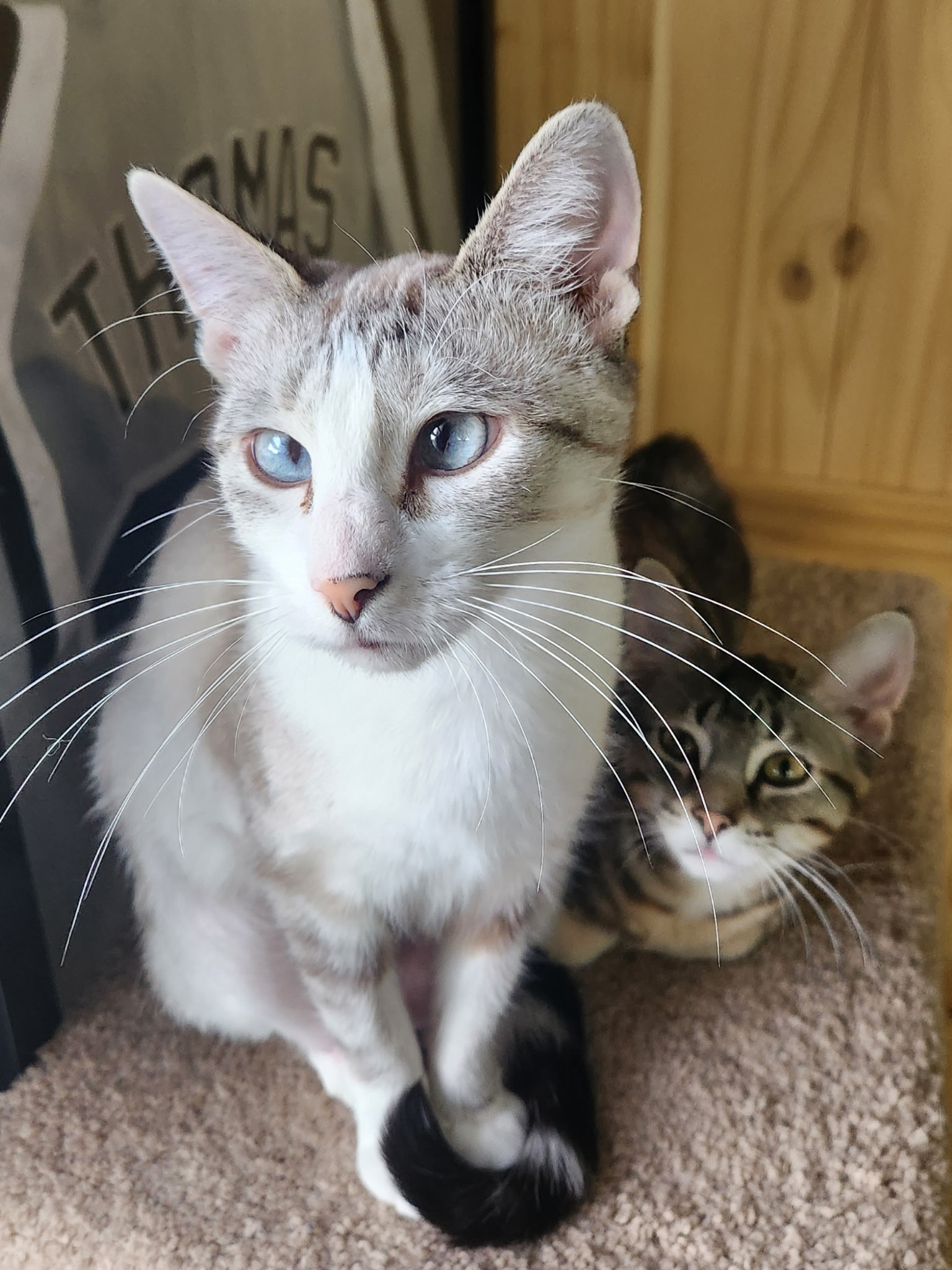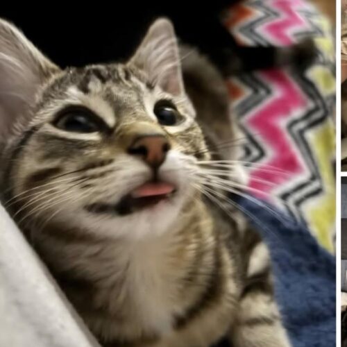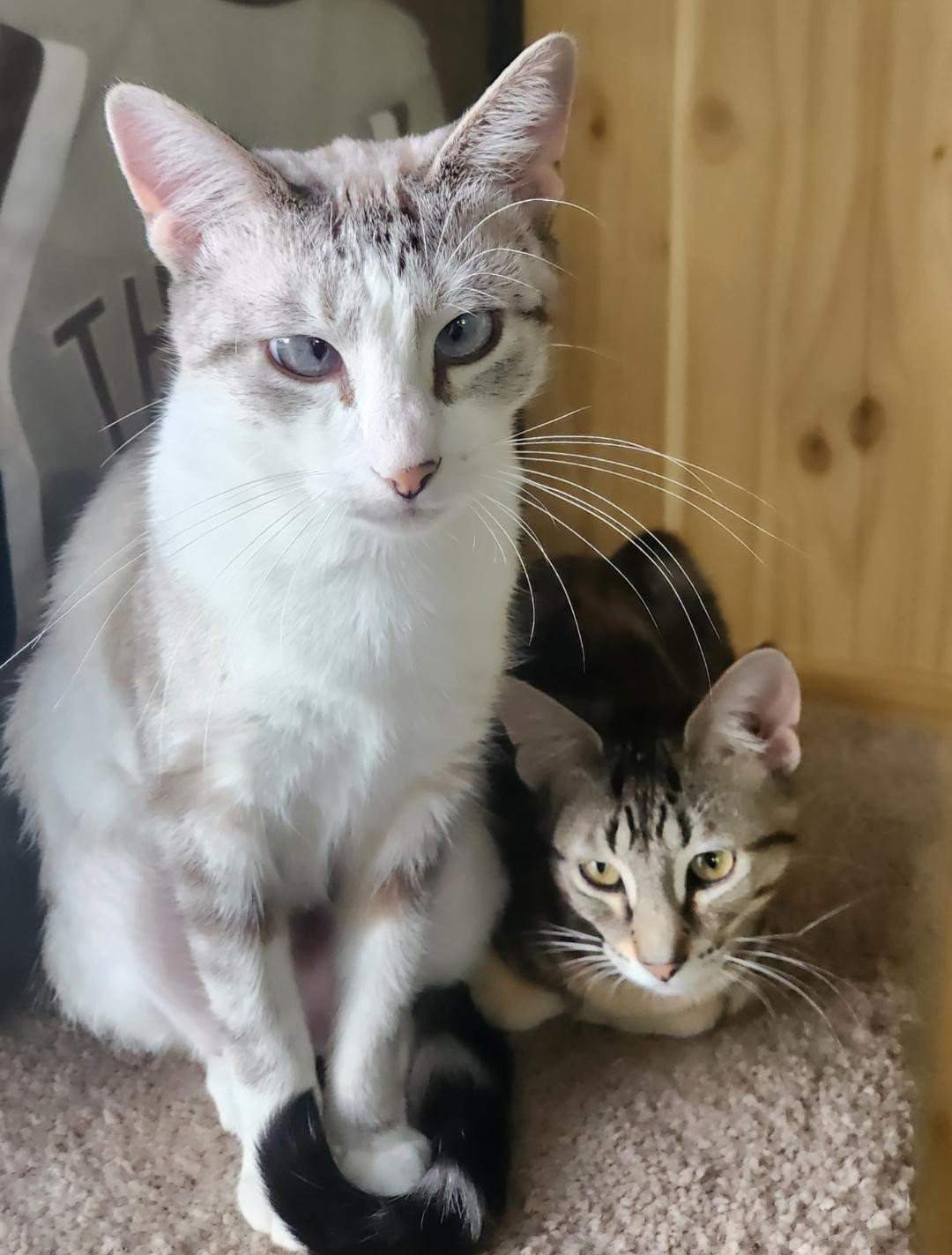 Butterfinger is scared of other cats and may hiss at them. Given that she and her mom were previously stray outdoor cats, it’s clear they’ve been through a lot. With patience, understanding, and a calm home, this bonded pair will thrive and continue to blossom.