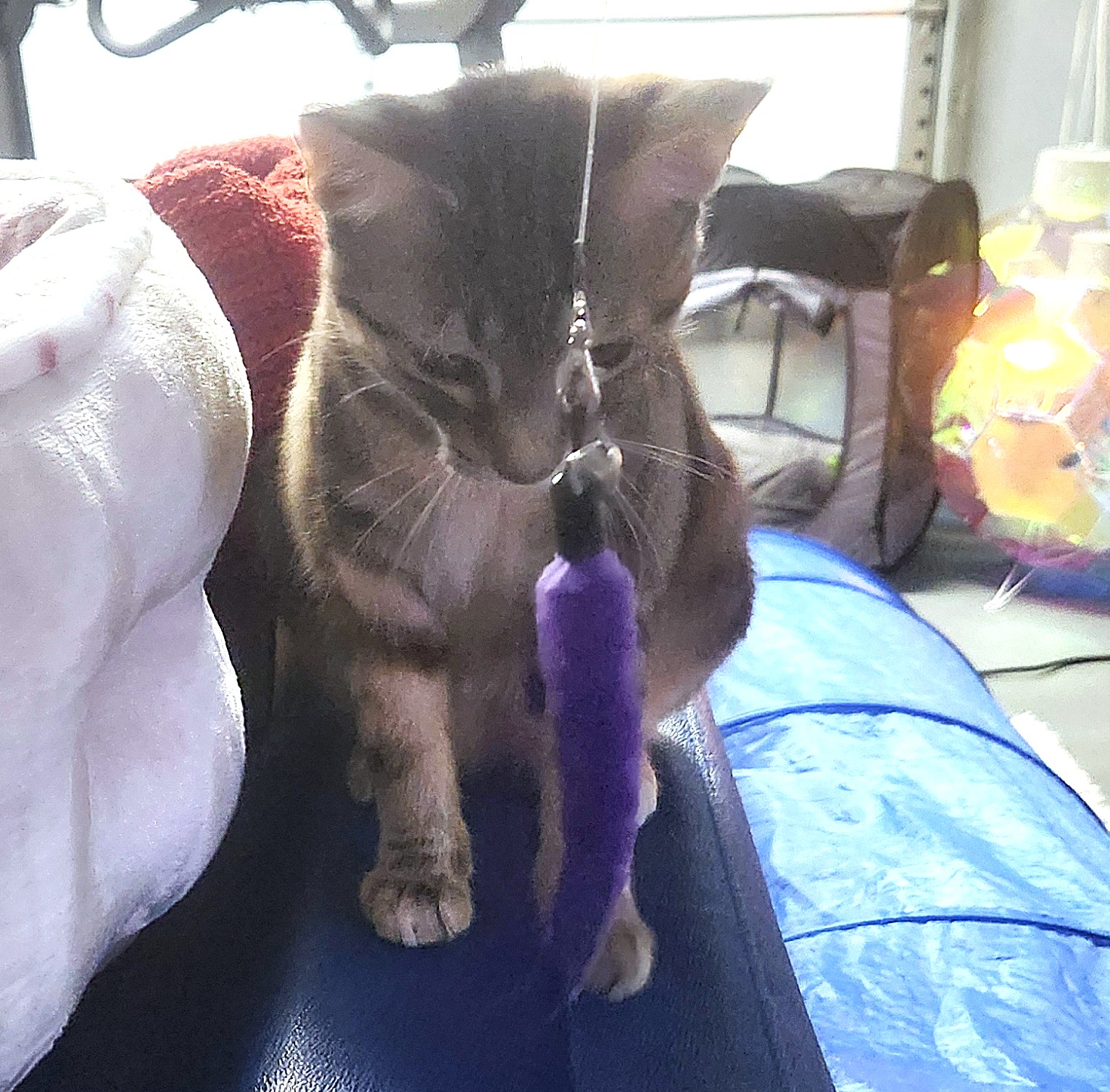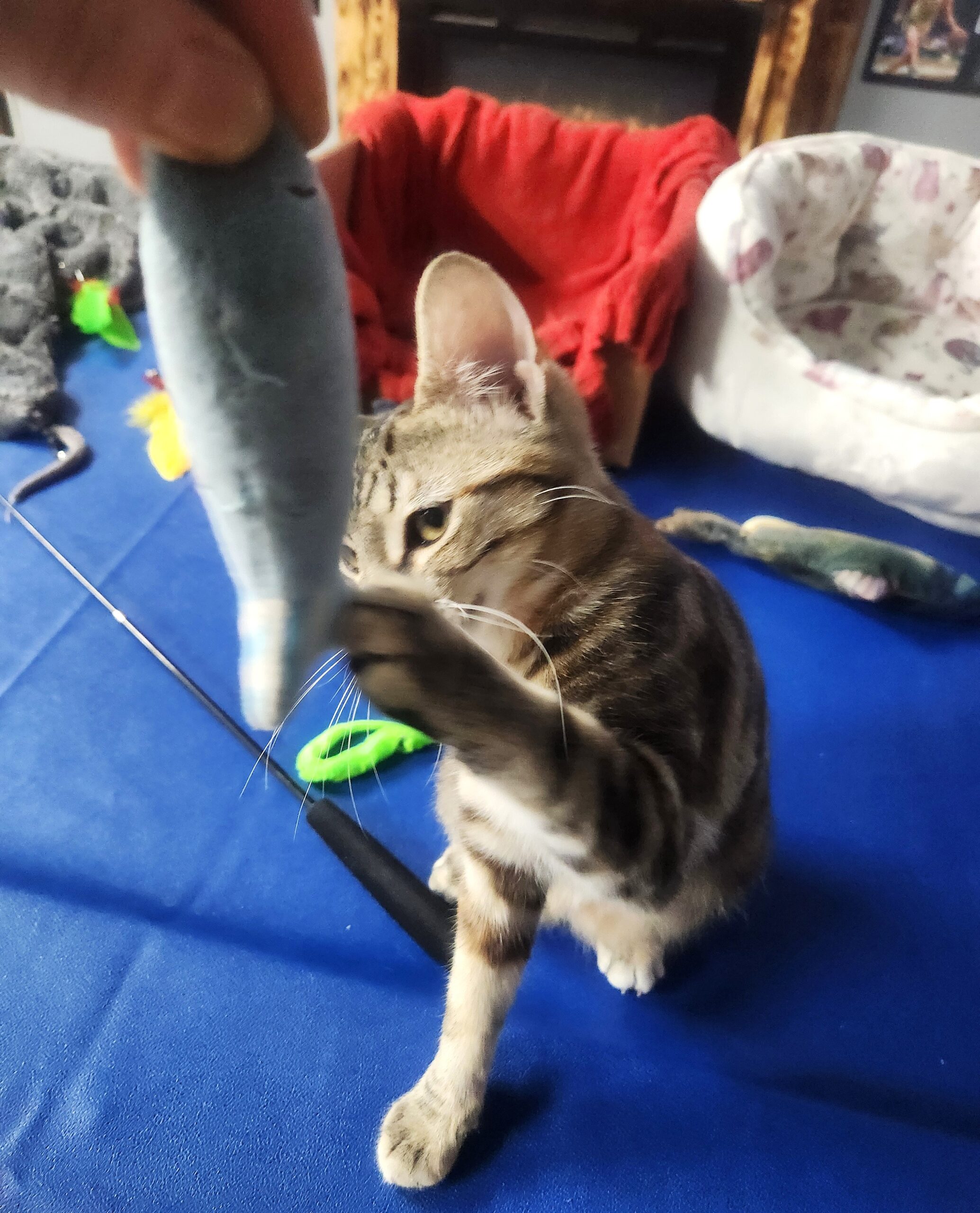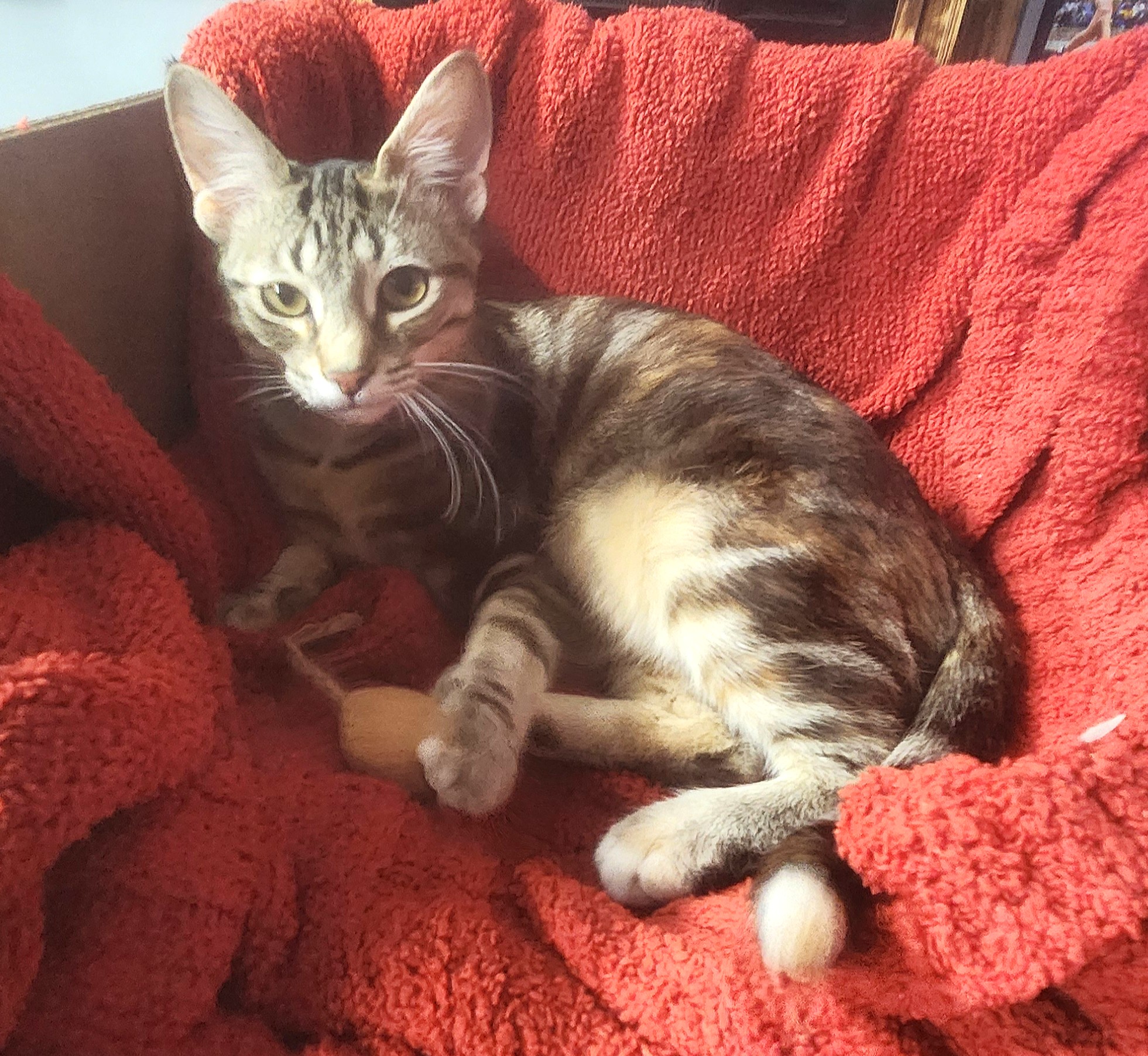 Butterfinger is a tiny ball of joy with a playful, silly personality. She loves fishing pole toys, interactive ball toys, and being near her people—affection is always on her terms, of course. Knowing she’s loved and protected gives her the confidence to truly be her happy kitten self.