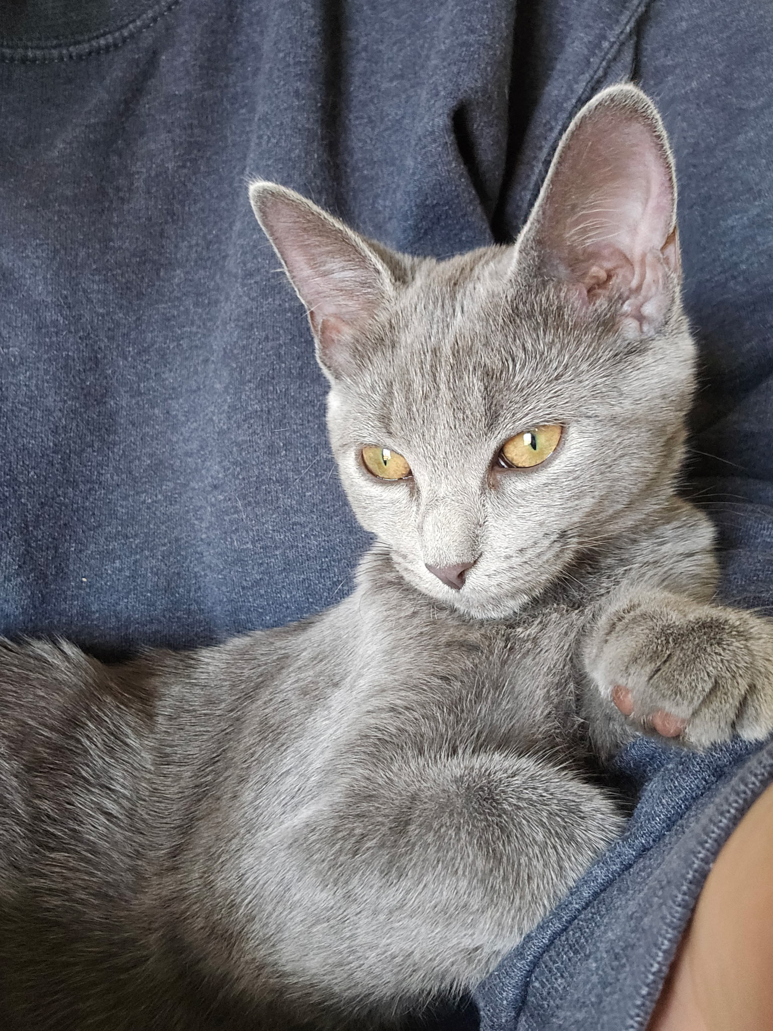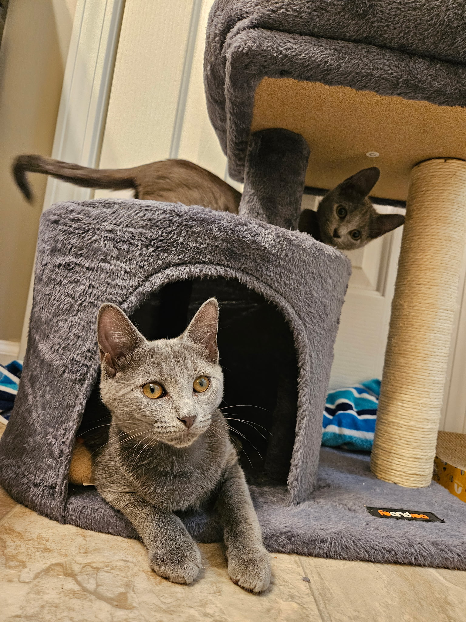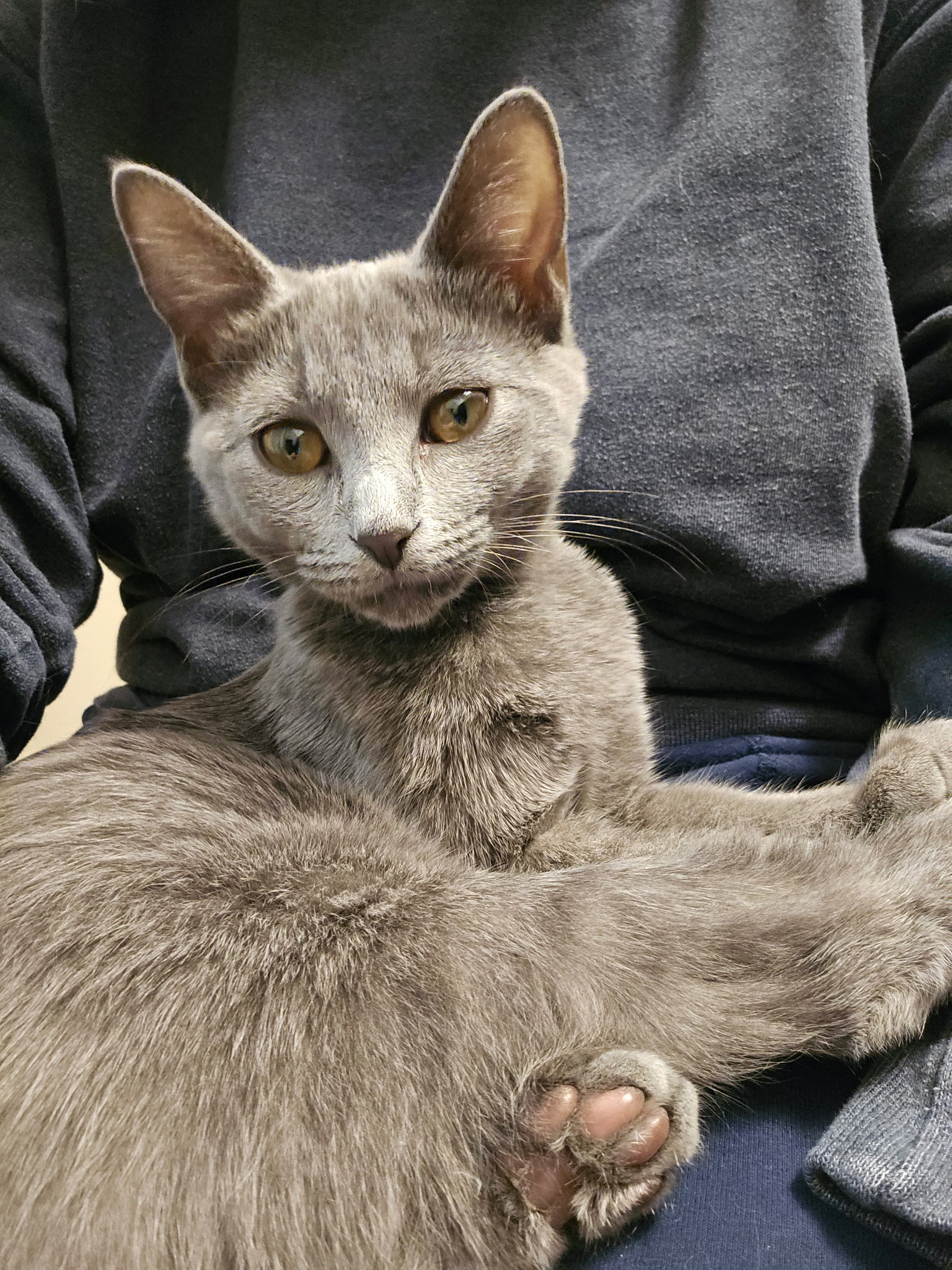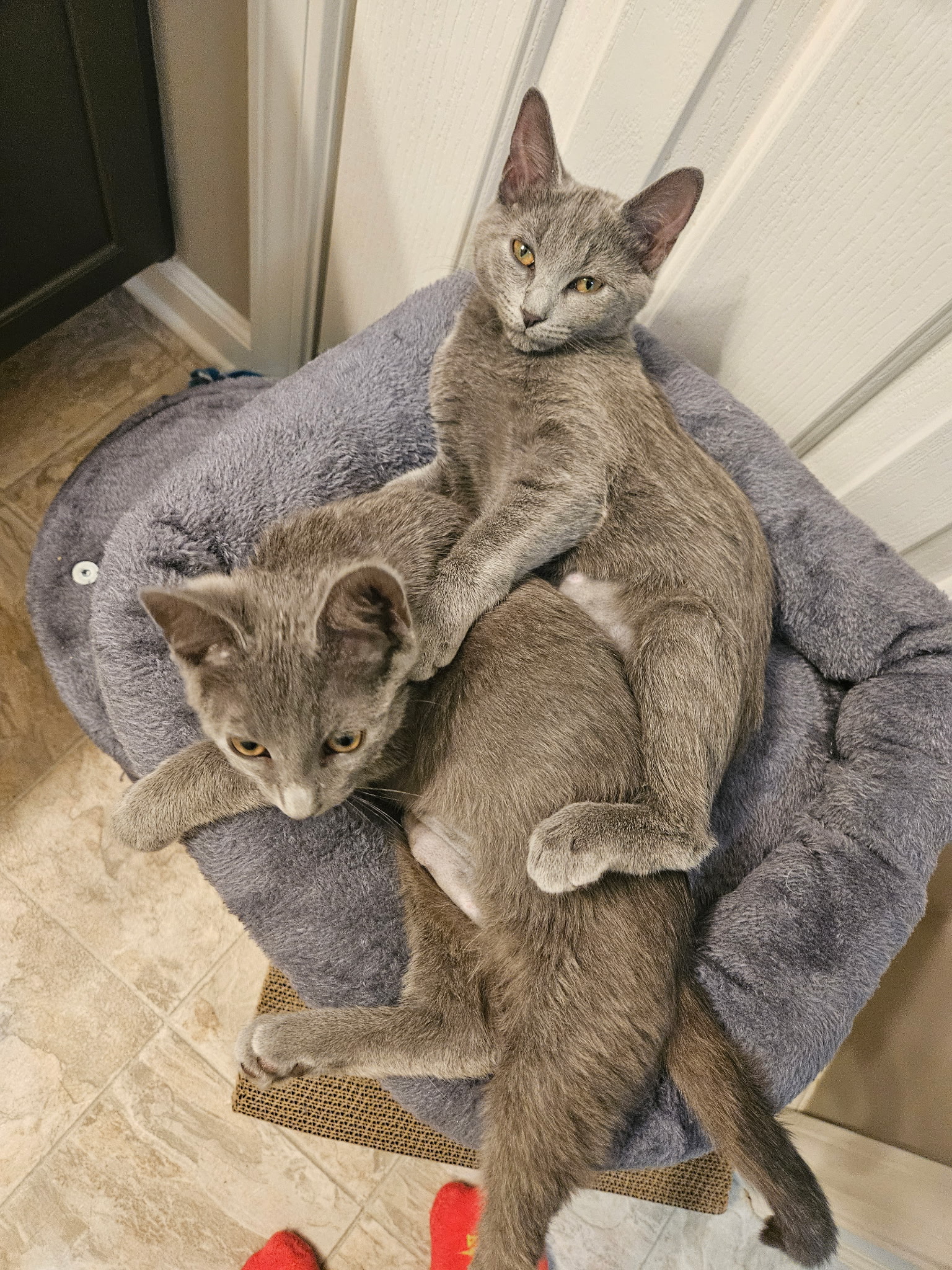 Comet & Stardust are a bonded pair of sisters who love to do everything together, even use the litterbox at the same time! Comet is the mellow "older sister" who loves to have lap naps and cuddle time with her humans. When she's all rested, she and Stardust play chase and wrestle. Comet has been very brave with exploring a house full of adult cats, and is curious to find new adventures. Would do well in a house with kids or other cats.