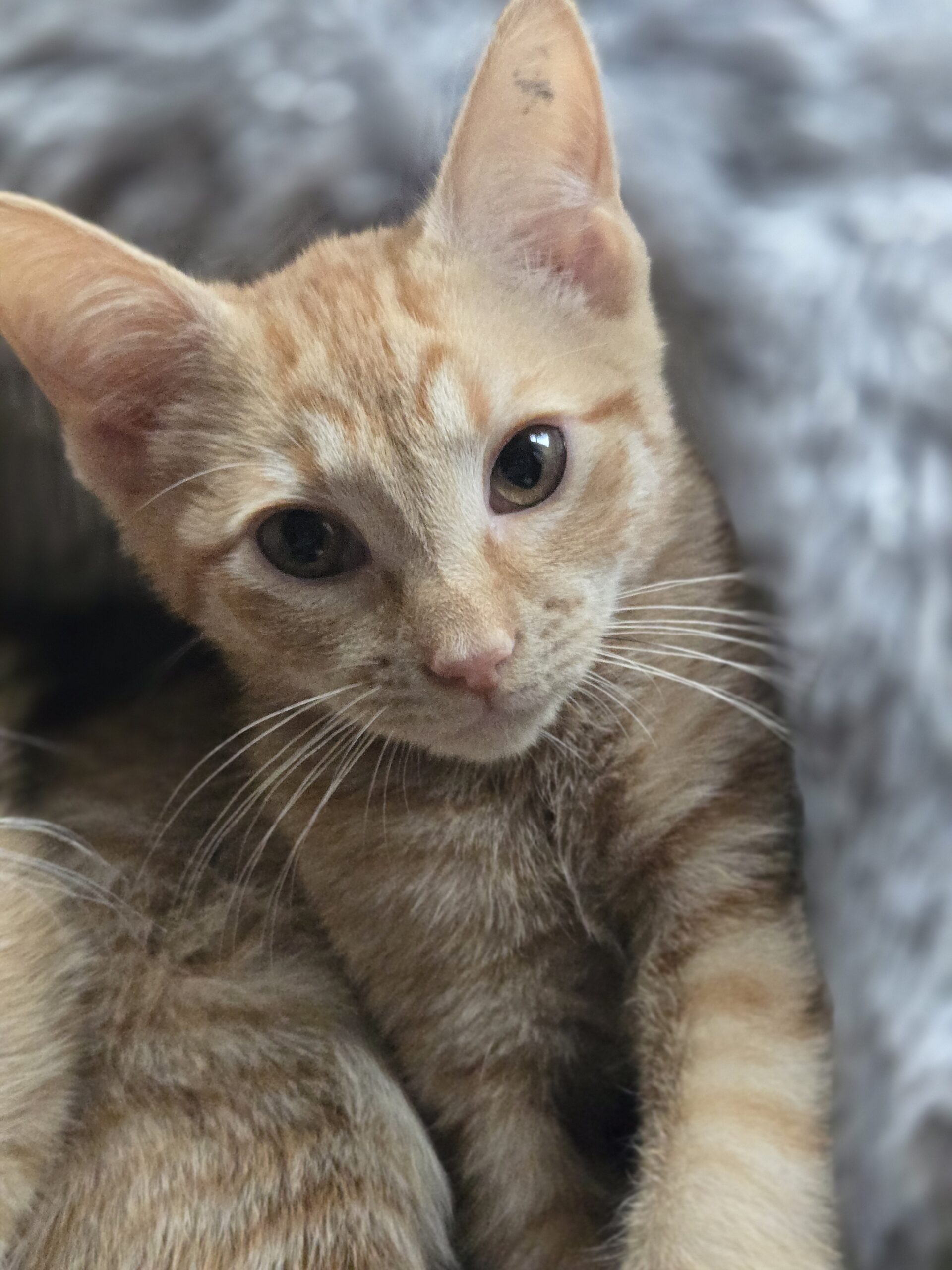 " Crinkie” is rotten and sweet in the best way. He gives significant orange cat energy, and if you know, you know. He loves to play and make new friends, but also enjoys snuggling and purring. Like all the Gingers in his litter, he has extra toes on his not-so-murderous mittens.