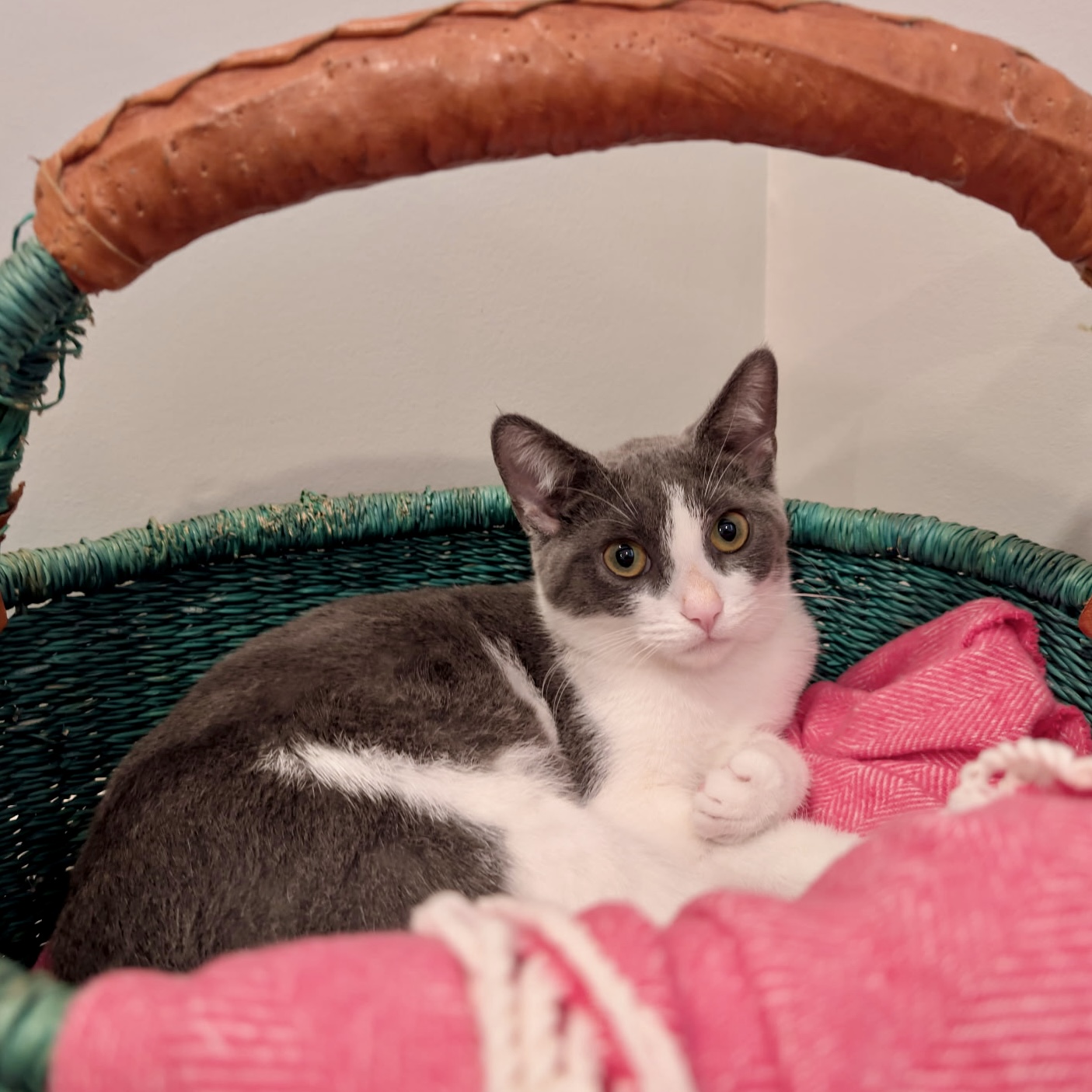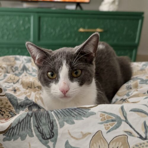 Cronut is a petite gray and white beauty with a purr like a Ferrari! Don’t let her concerned look fool you—she’s a playful little lady who loves feather toys and snuggling in close for cuddles. Cronut would love to be adopted with Beignet, but absolutely needs a kitten or young friend in her new home.