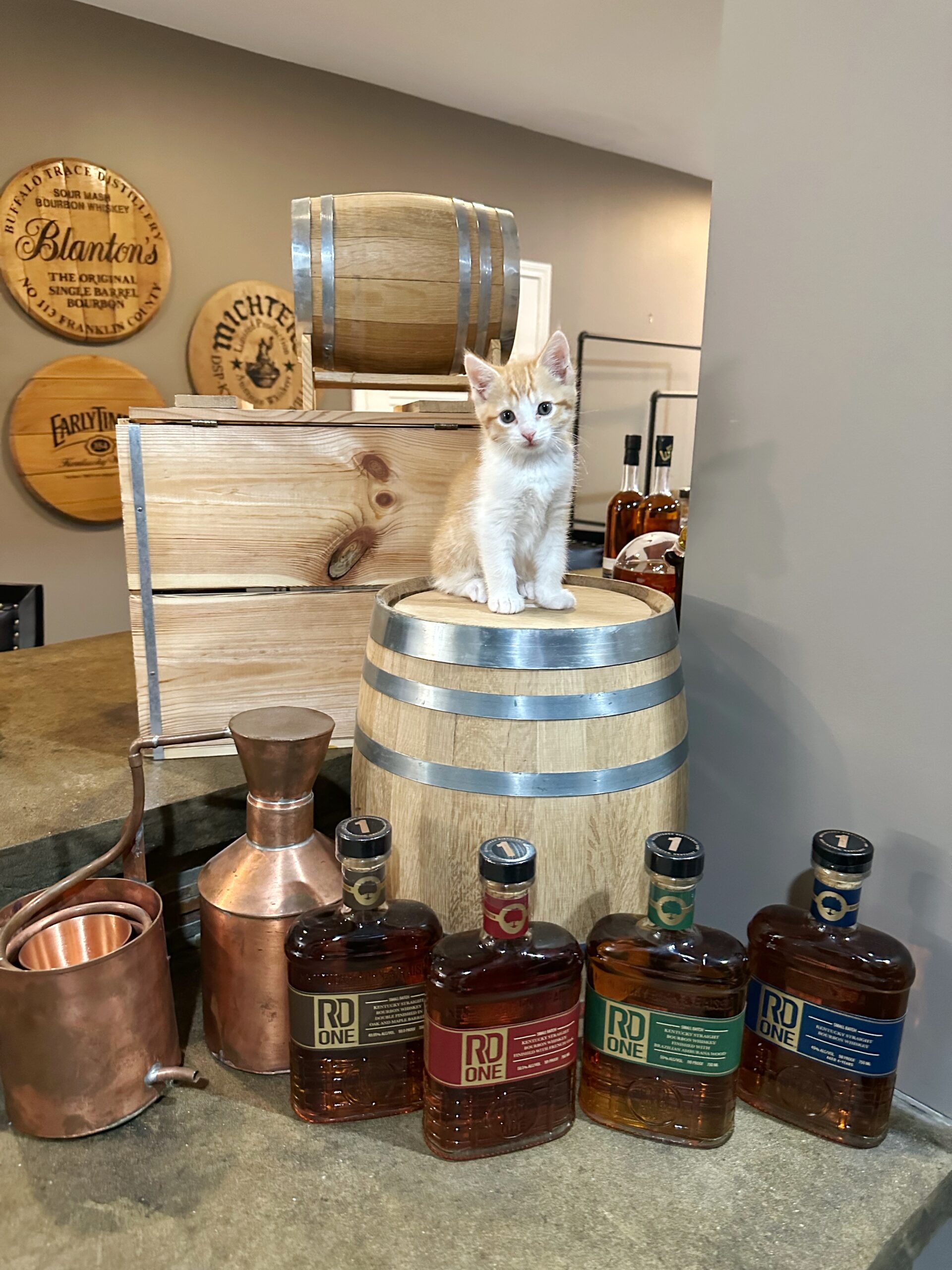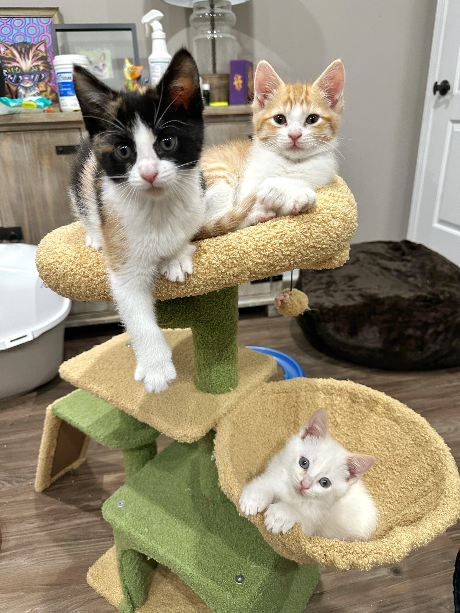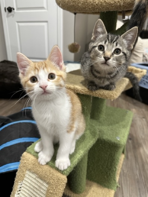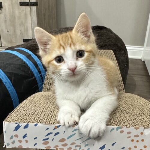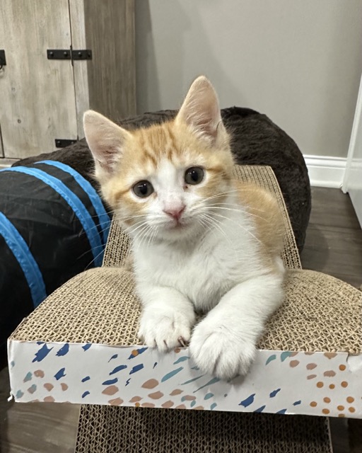 He loves snuggling in the hammock of the cat tree, zipping through the kitten tunnel, and chasing after bouncy balls with his siblings.