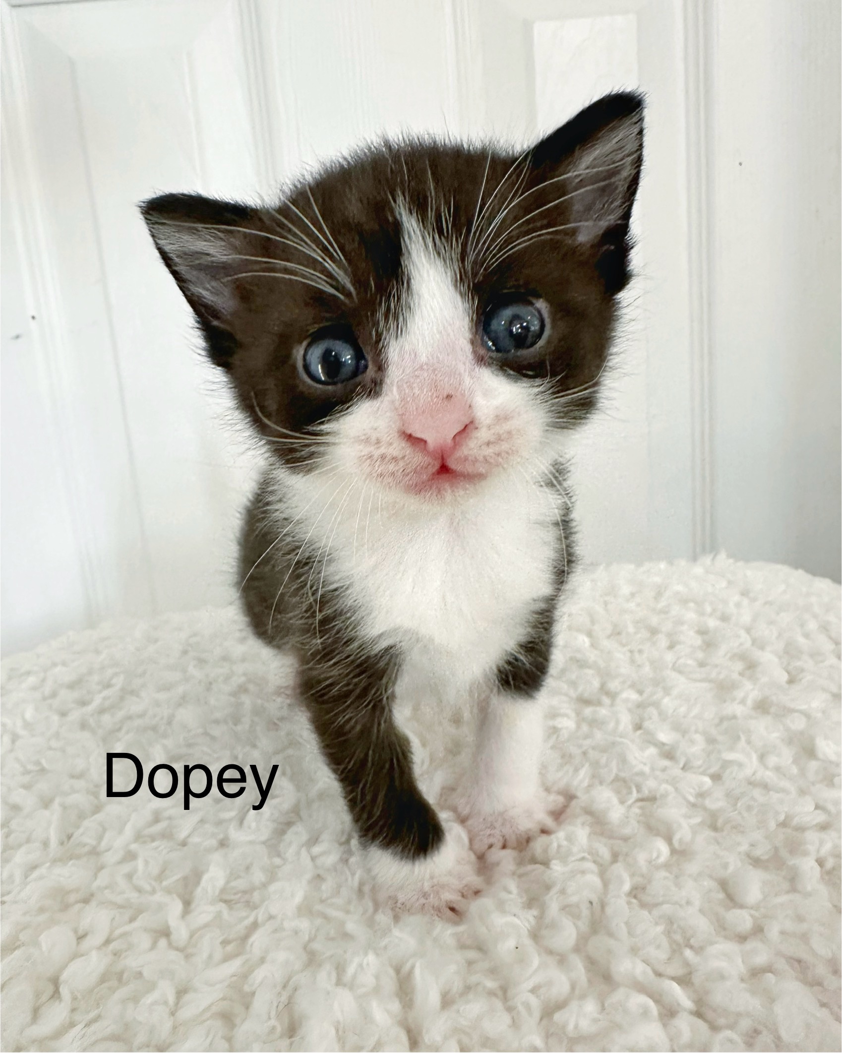 Dopey is neutered, microchipped, litter trained, and up to date on vaccines. Birthday: July 2, 2025.