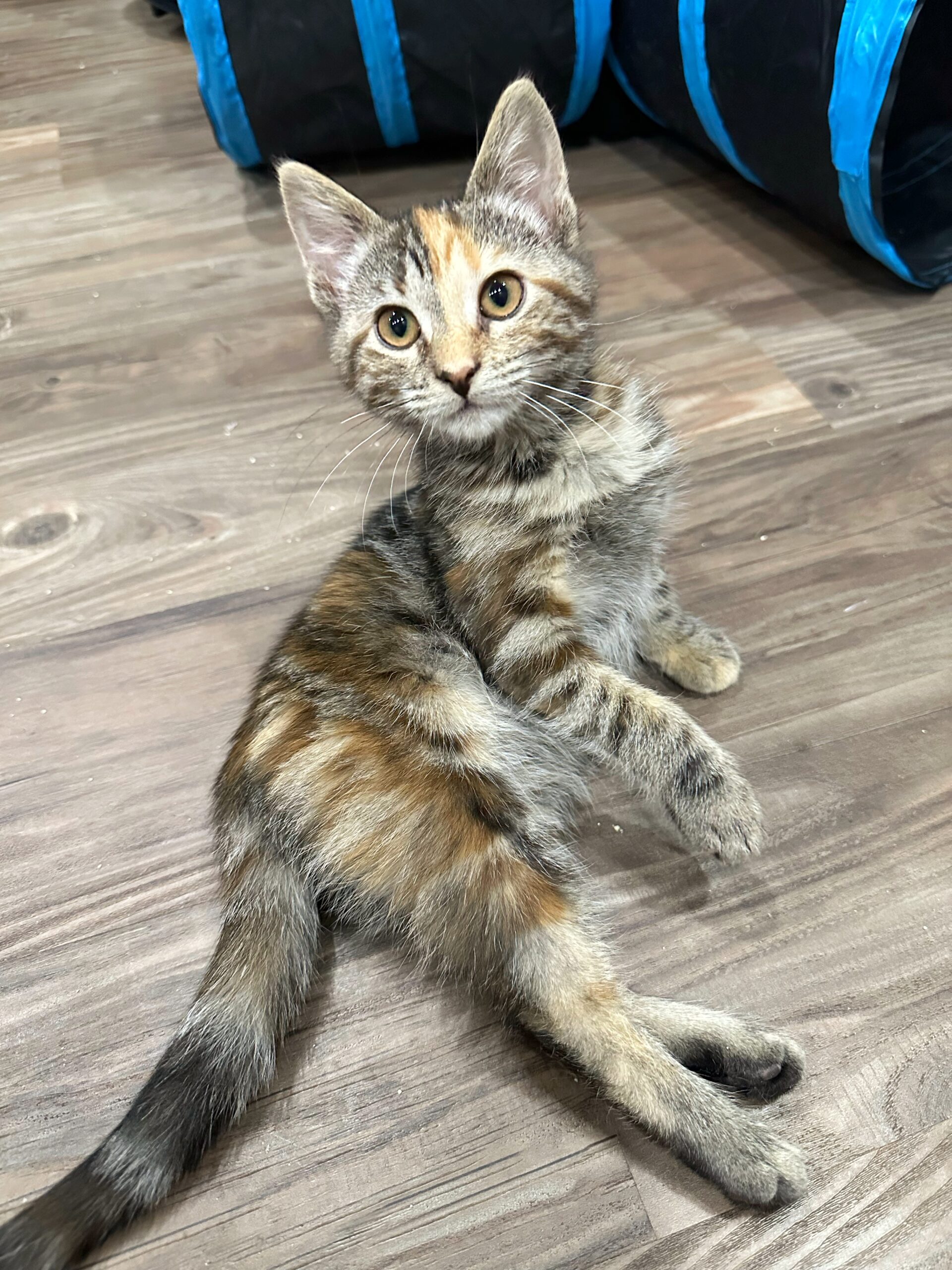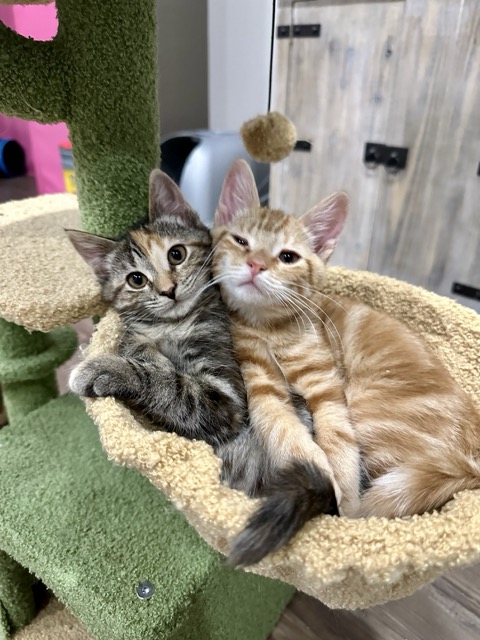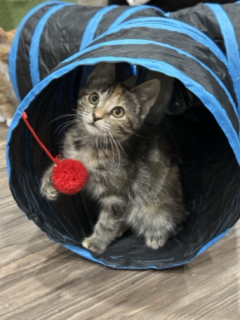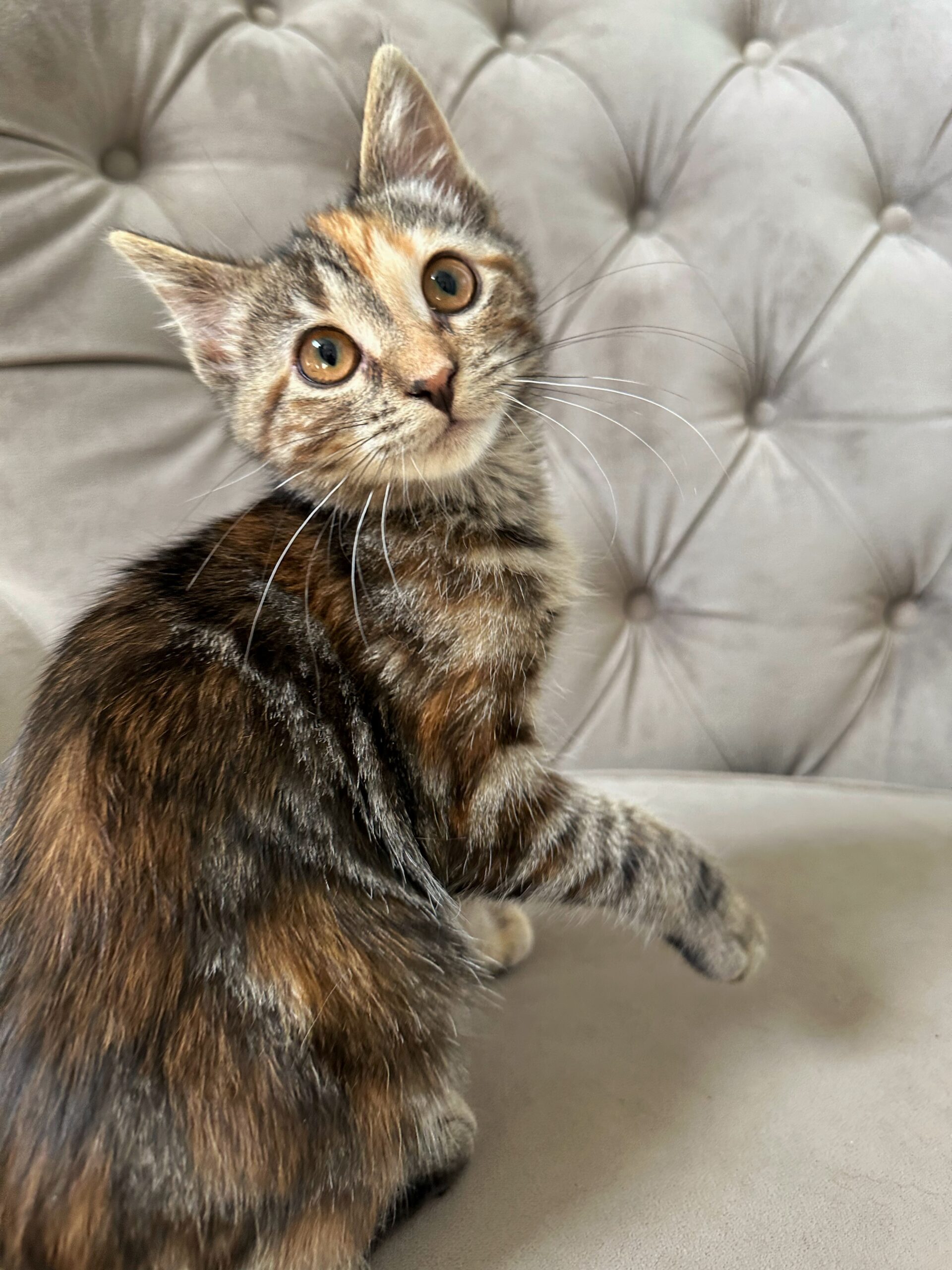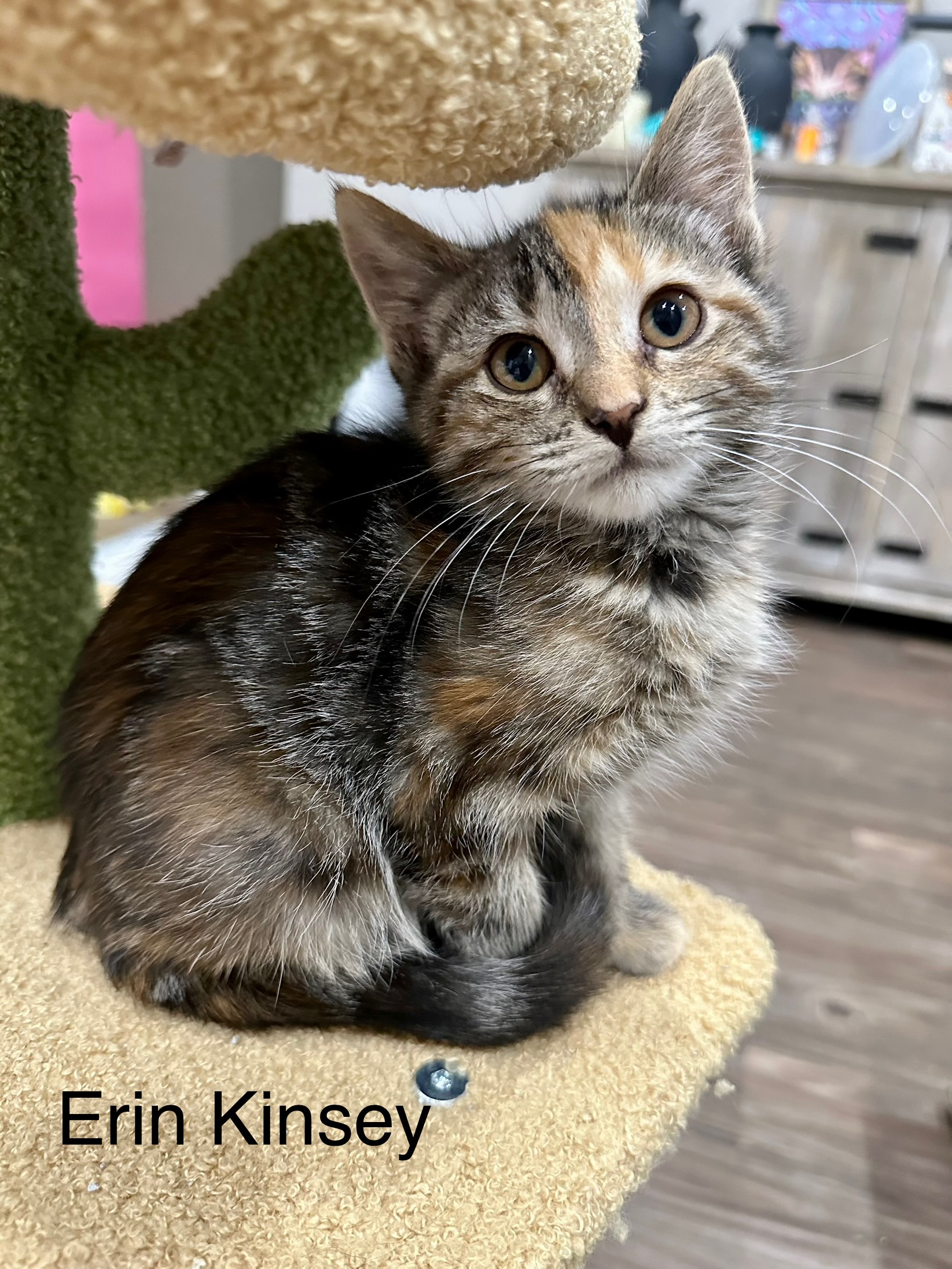 Erin is a sweet and playful little country star who loves chasing toys, climbing cat trees, and cuddling with her littermates. What makes her extra special is her unique “torbie” coat—a stunning blend of tabby stripes and tortoiseshell swirls that looks just like beautiful marble! She’s friendly, affectionate, loves to purr loudly, and always curious about what her people are up to. Erin would love to be adopted with a sibling (Jon, Lainey, or Miranda) or go to a home with another young cat to be her friend. Litterbox trained, spayed, microchipped, and up to date on vaccines. Estimated birthday: 5-7-25.