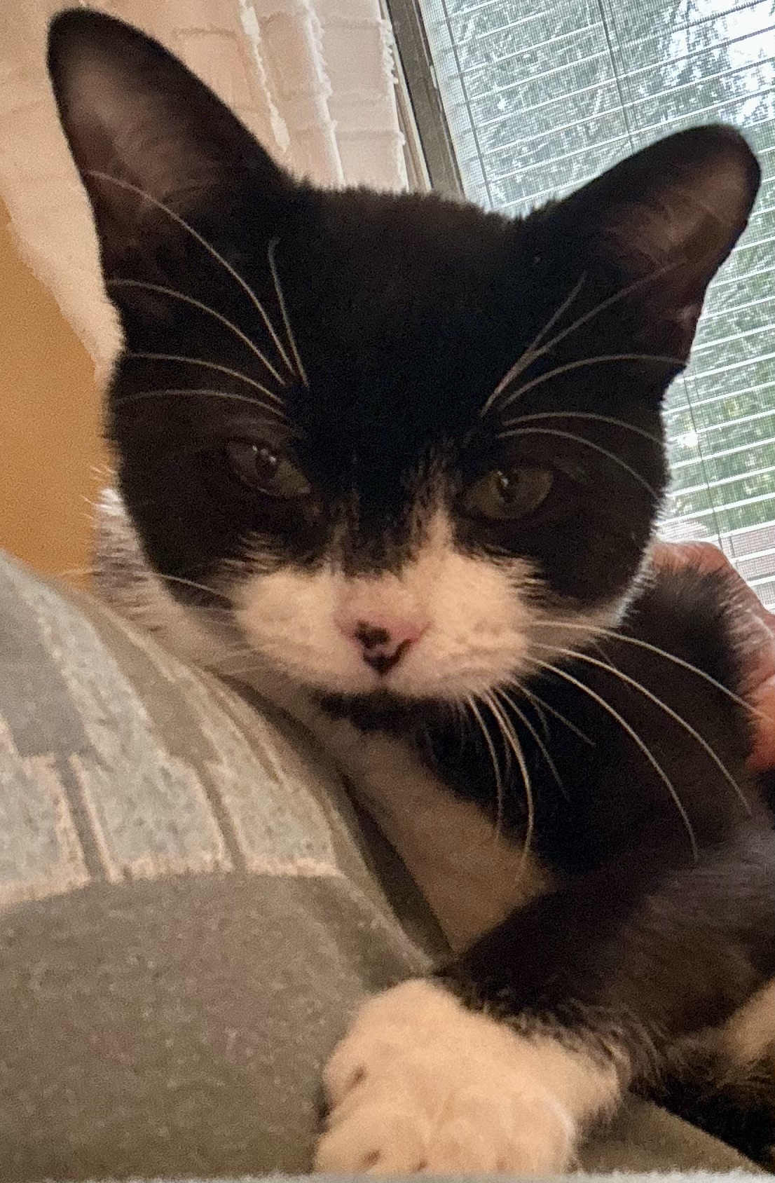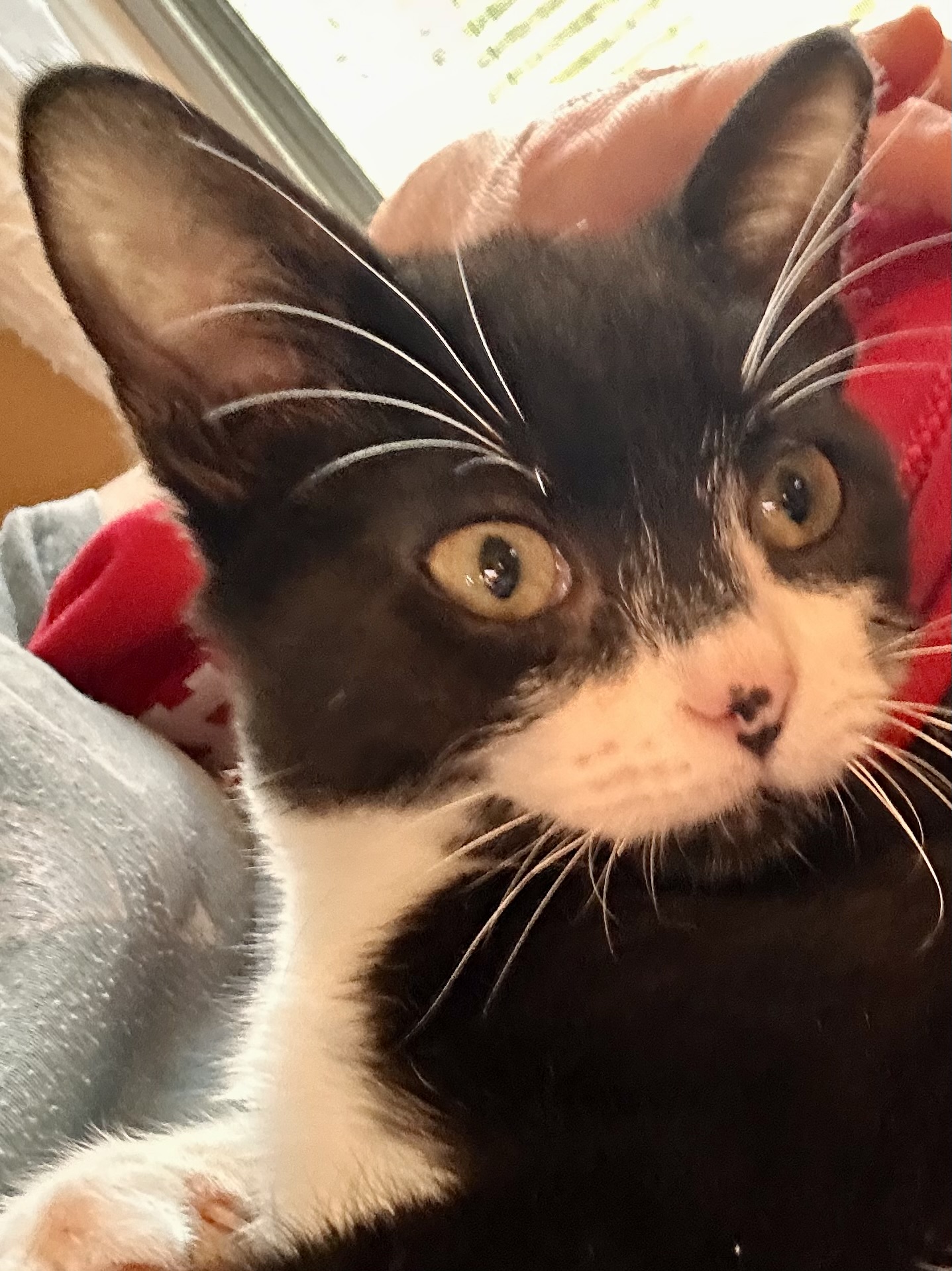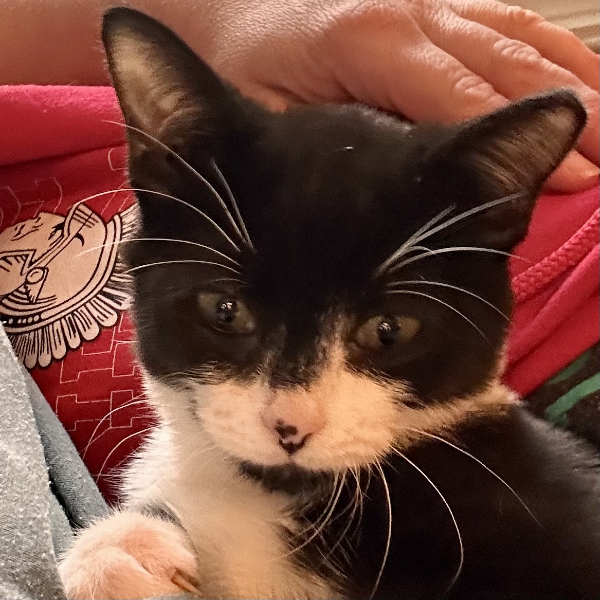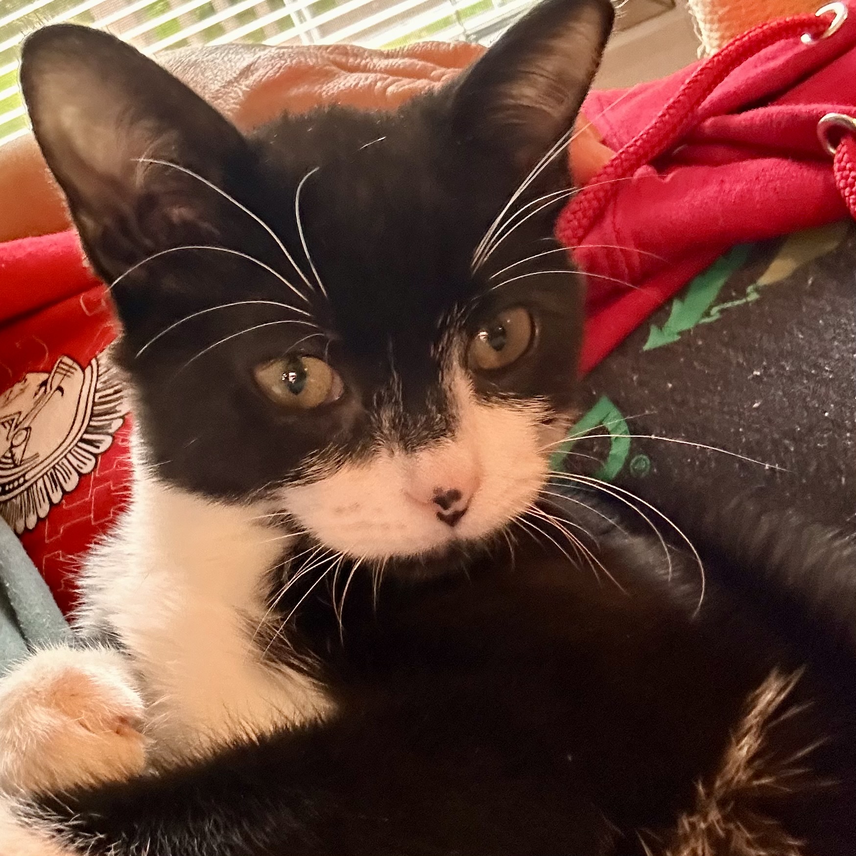Fettuccine is a petite, sweet, and playful little tuxedo kitten with striking black and white markings and a mask that makes him look just like Batman. He’s full of personality, curious about the world around him, and always ready for a fun play session. When playtime is over, he’s happy to curl up for snuggles and show off his softer side. Fettuccine would love to find a forever home where he can continue his adventures, hopefully with one of his siblings who are also available for adoption.