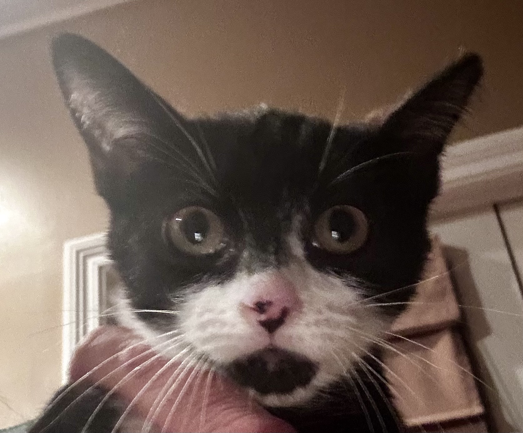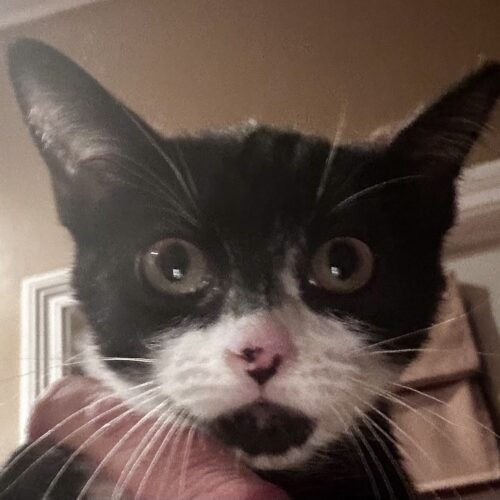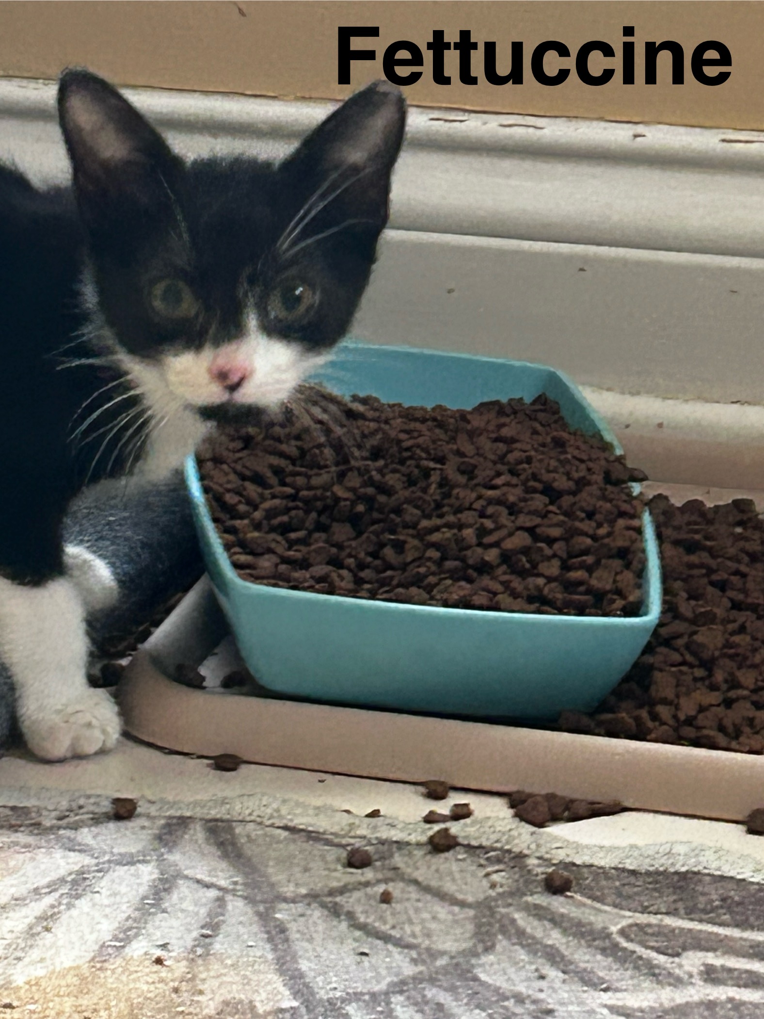 Fettuccine is a petite, sweet, and playful little tuxedo kitten with striking black and white markings and a mask that makes him look just like Batman. He’s full of personality, curious about the world around him, and always ready for a fun play session. When playtime is over, he’s happy to curl up for snuggles and show off his softer side. Lasagna would love to find a forever home where he can continue his adventures with his sister, Rigatoni, who is also available for adoption. Together, they make the perfect dynamic duo.