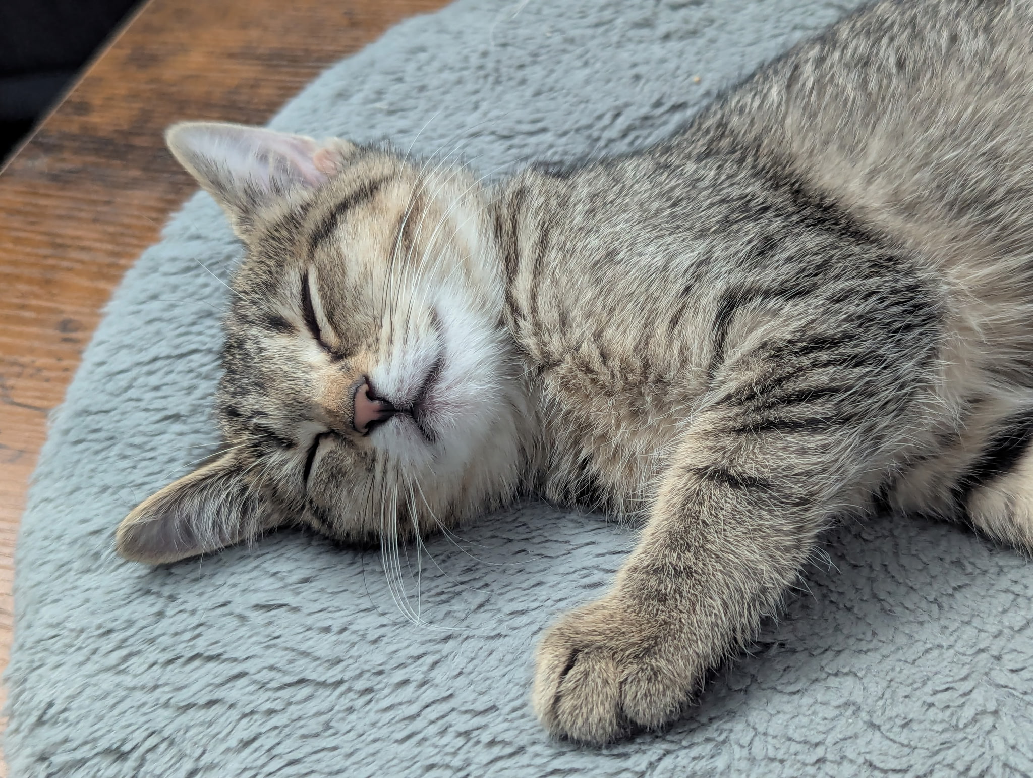 Fia is a bright, independent girl with a mischievous streak. She enjoys testing boundaries and seeing just how much she can get away with. When she’s feeling affectionate, she melts right into your arms and loves being held and cuddled. If she’s not in someone’s lap, she’s busy trying to outsmart our cat‑proofing to explore new territory or darting around the house, plotting the perfect spot to surprise us as we walk by.