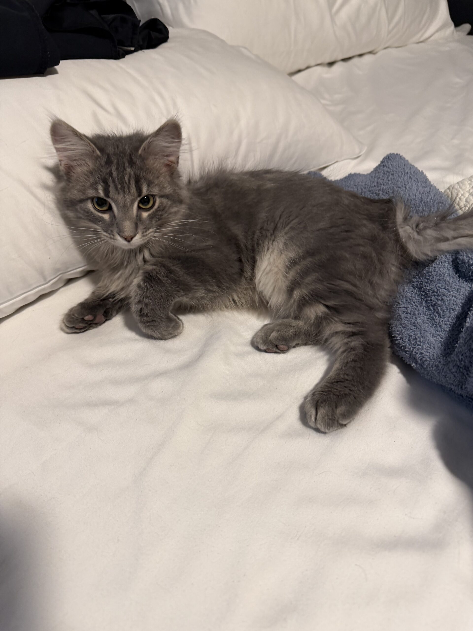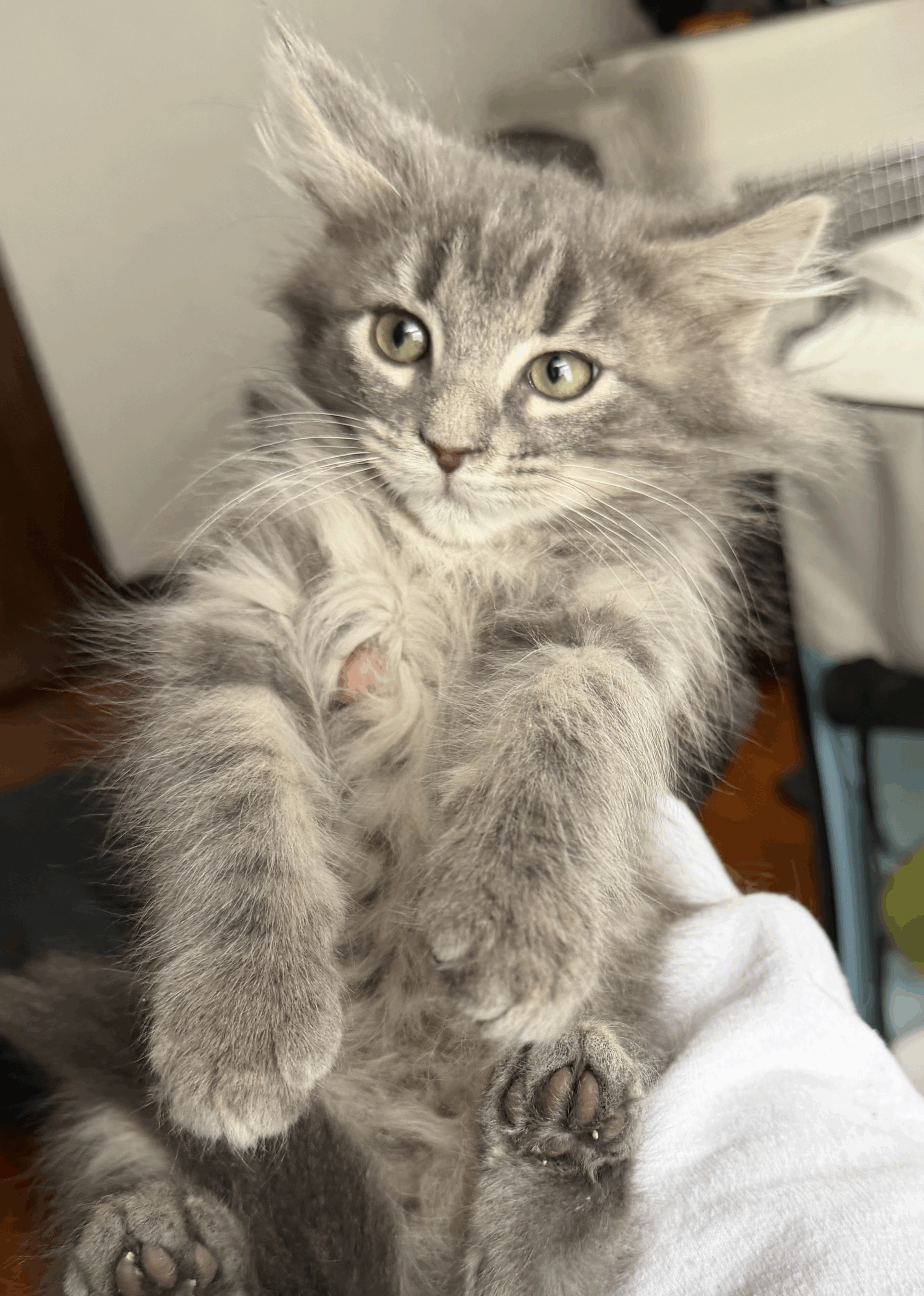 Gravel may be small, but he’ll cement himself in your heart in no time. This playful, affectionate boy loves wrestling with his sister Concrete, chasing toys, and purring at full volume. When he’s all tuckered out, he happily settles in to make sweet little biscuits on a cozy blanket (or you!)—especially if Concrete is right by his side.