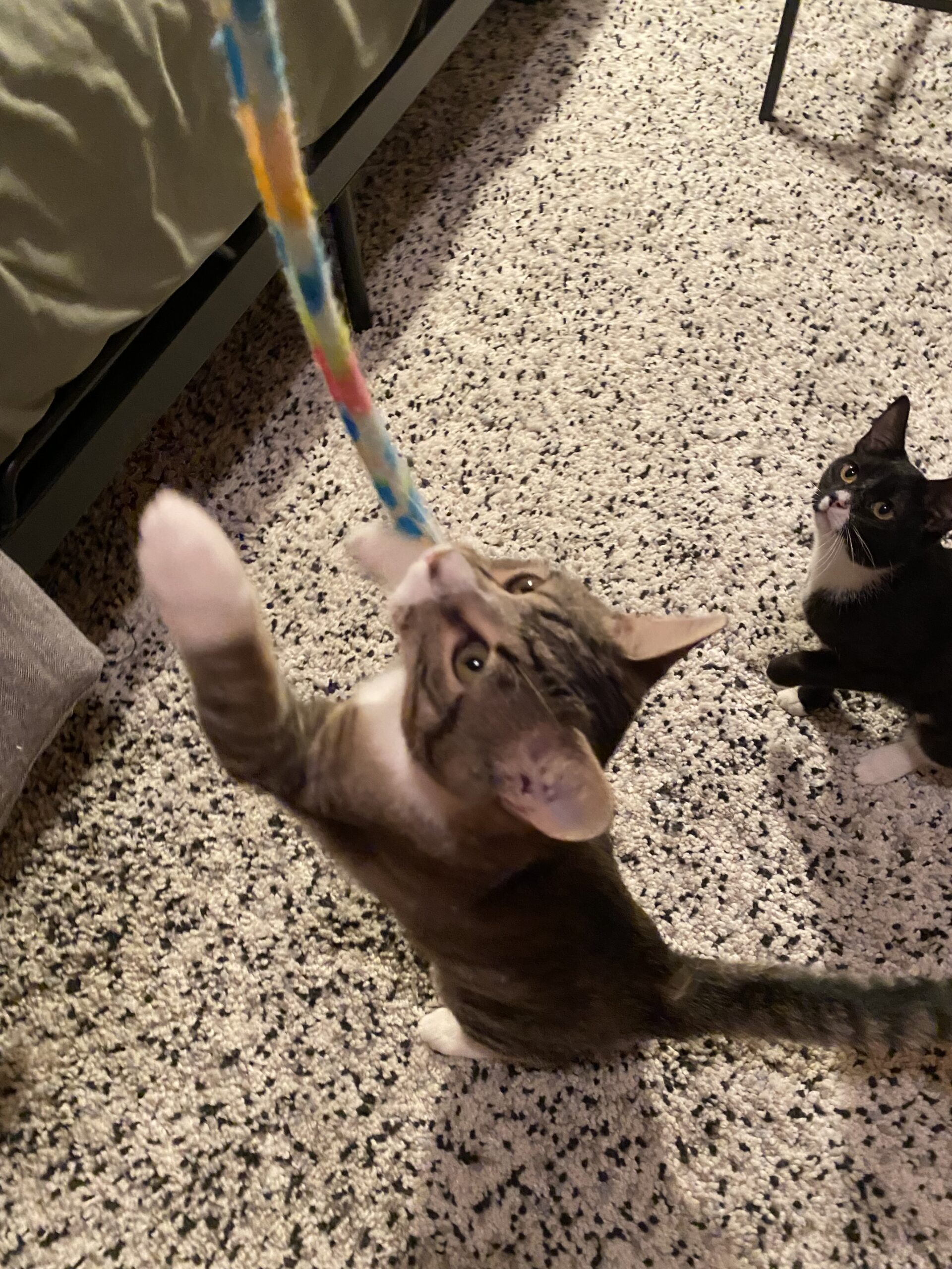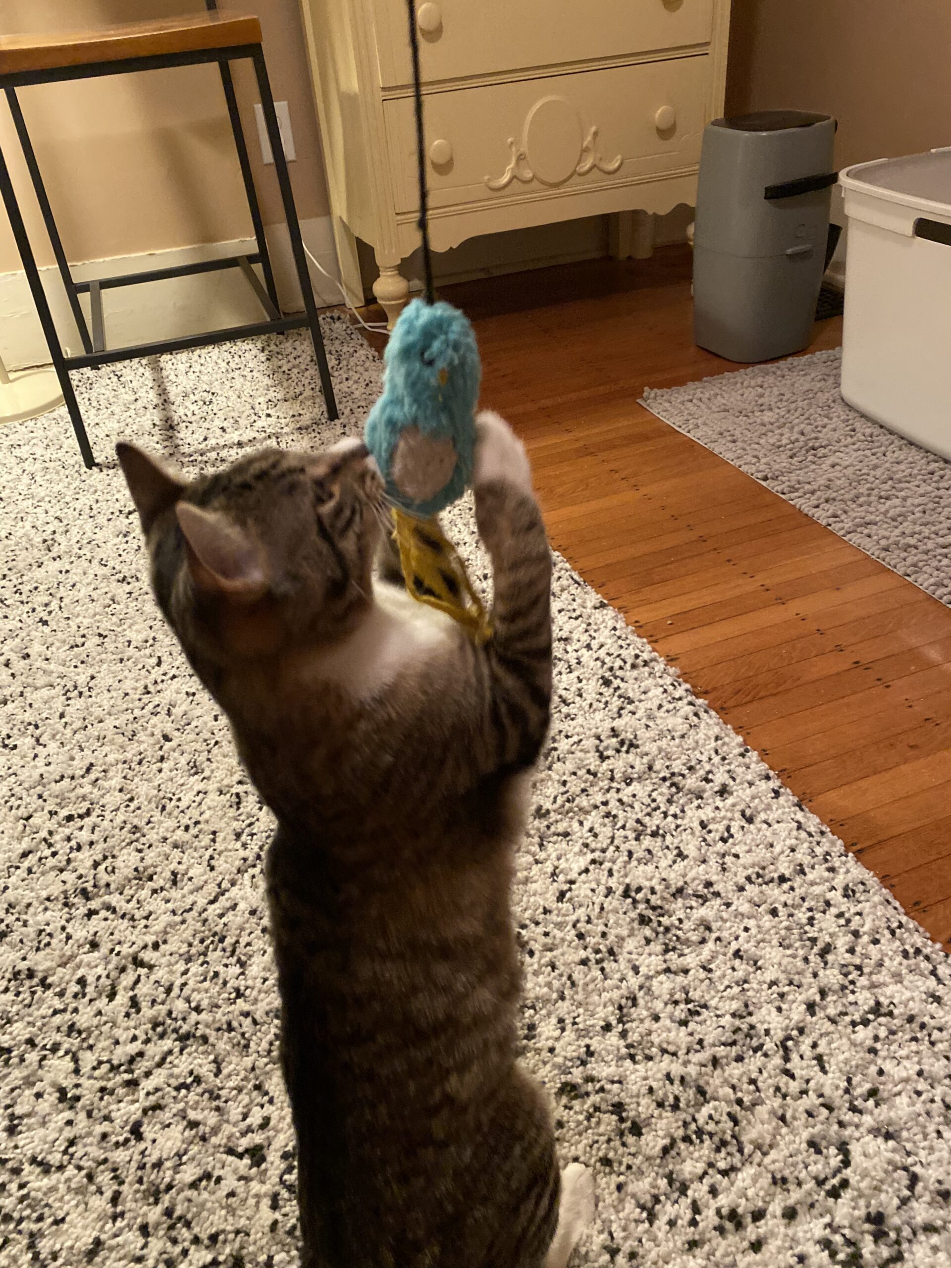Harold starts purring when his favorite person is close, rubbing against your legs and looking for ear scratches and lots of pets. He takes his job as a protective brother for his littermate, Kitty, seriously and has that look of a serious and vigilant caretaker. But his playful side comes out when he jumps for the bouncing bird on a stick toy or chases the wiggly ribbon. He’s a lover and such a sweet boy.