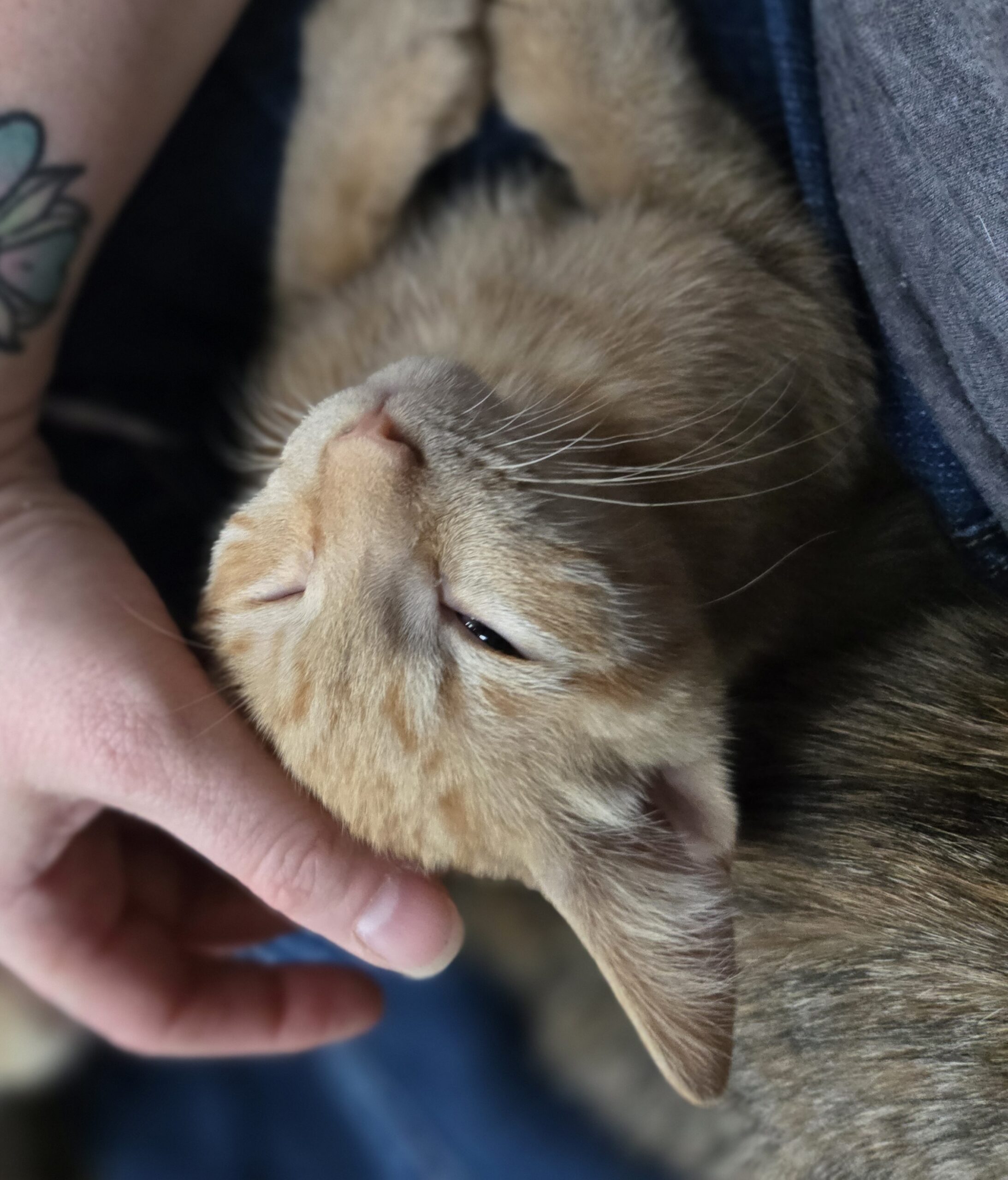 “Homie” is an adventuresome French fry. He is the first to explore and is fearless. Like his orange siblings, he is also equipped with extra toes. His color is a little more dilute than his siblings. Still, he has the same lovely disposition and has serious lap kitty potential.