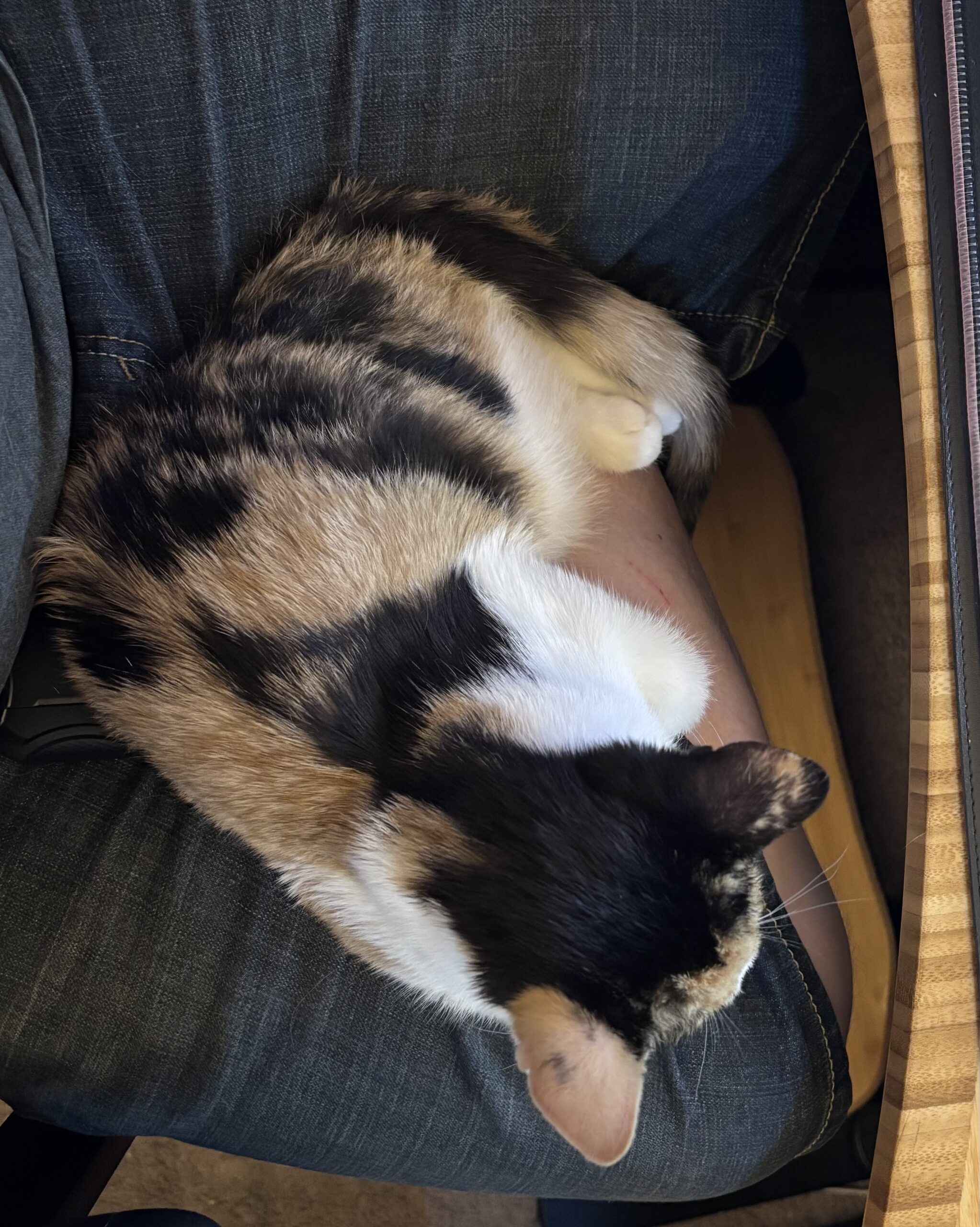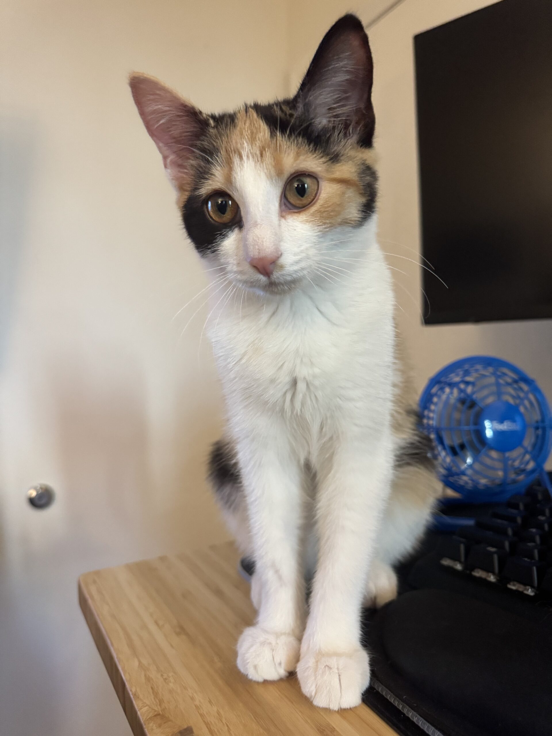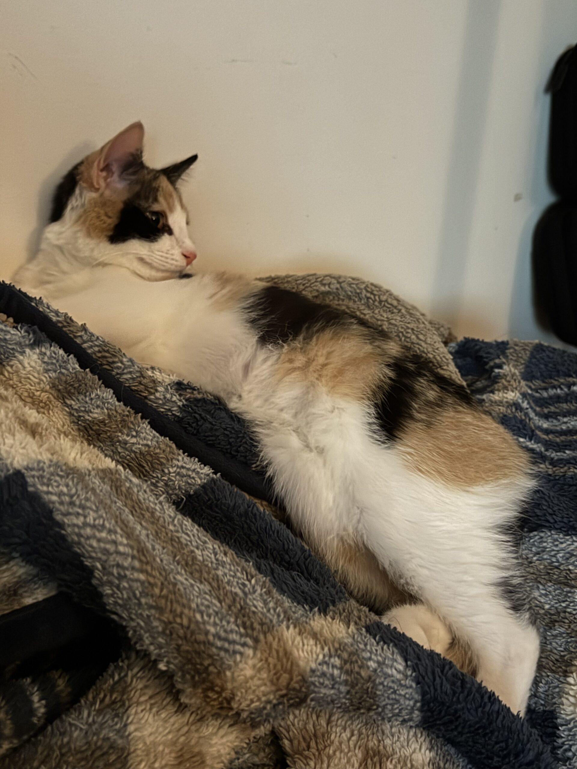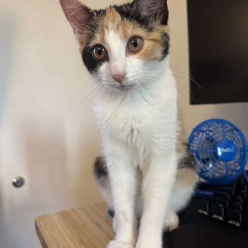 Kumori, which means “cloudy” in Japanese, was named for her patches of color. She’s a sweetheart and enjoys cuddles and pets, often sleeping nearby or in a lap. She prefers her own space with other pets but can peacefully coexist; playing with toys, investigating, and exploring are better activities for her. She would probably do best with older or calmer pets and children.