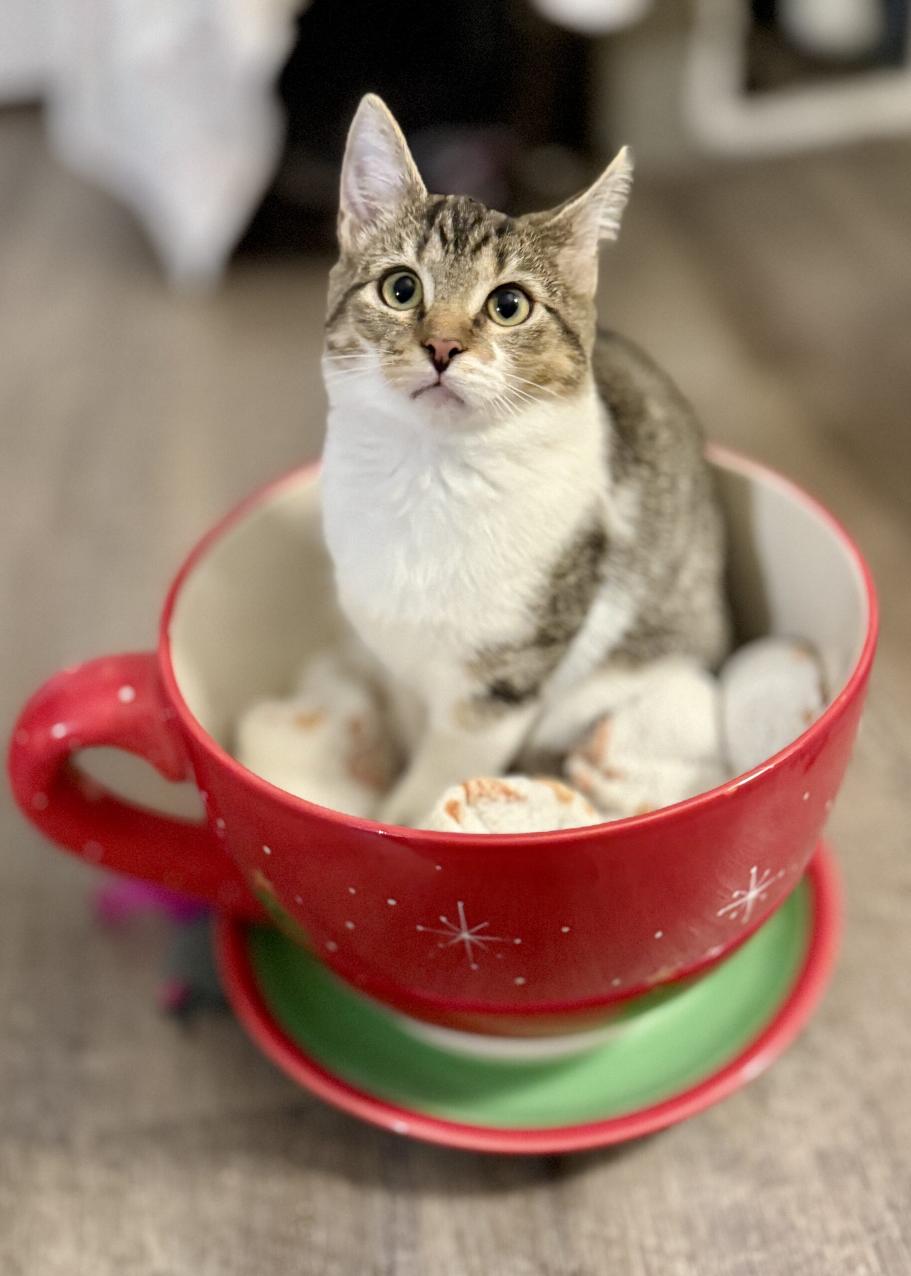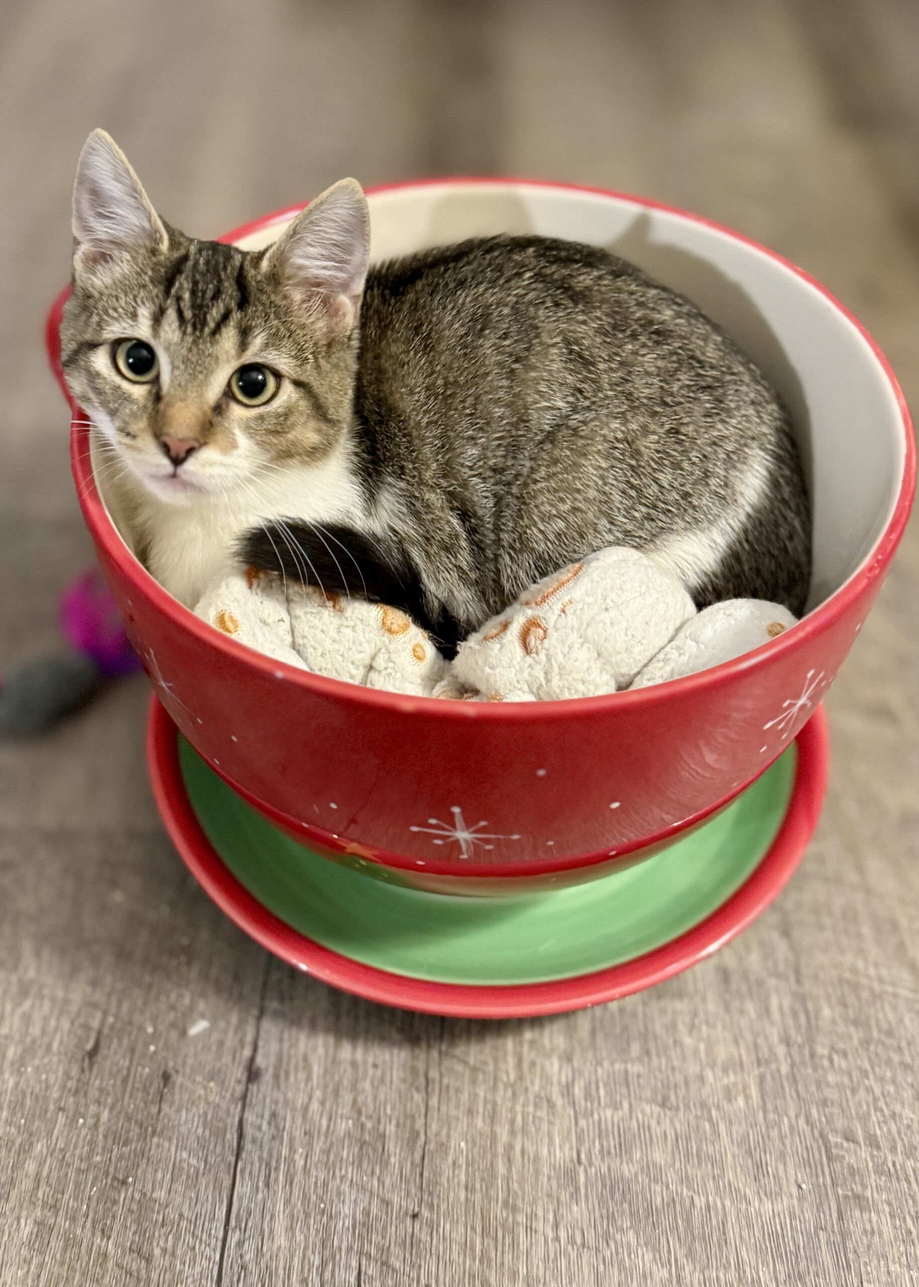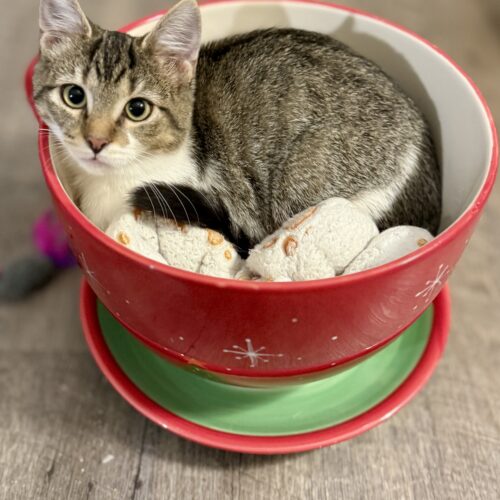 Like her namesake, Margarita is a classic with a twist! This beautiful brown tabby girl with white markings has the most stunning, soulful eyes that will melt your heart. She’s playful, affectionate, and always ready to join the fun. When she’s not chasing toys, Margarita is happy to snuggle up for a cozy nap.