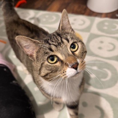 Meatball is a small tabby with white socks. He loves pets and is very vocal about it!