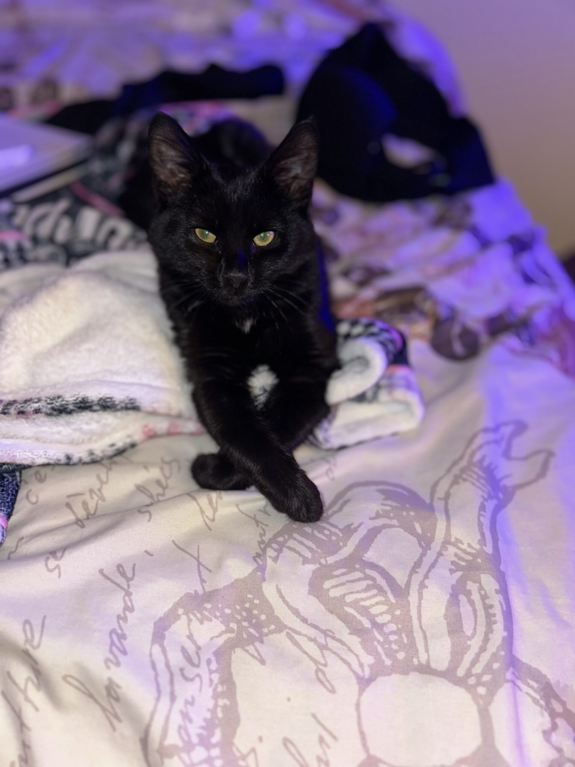 We don’t know much about Minnie Moo’s past, but it’s clear she’s been through some tough times. When she first came to us, she was very timid and unsure of people. With time, patience, and love, she’s started to blossom. Minnie Moo now enjoys being petted—on her terms. She’ll let you know when she’s had enough with a gentle nibble. She’ll need a patient home that understands her boundaries and lets her come around at her own pace. This petite, beautiful black cat has lived with children and currently lives with other cats, both adults and kittens. She gets along well with everyone and loves to play! At wet food time, she turns into quite the chatterbox and will make sure you know you’re not serving fast enough. Minnie especially enjoys bedtime, often snuggling up to her foster sister, and she loves curling up for a nap next to her foster mom after work. She’s truly a sweetheart who just needs someone willing to give her time, patience, and love. Minnie Moo is spayed, up to date on vaccines, microchipped, dewormed, and tested negative for FIV/FeLV. Her estimated birthday is 4/4/24.