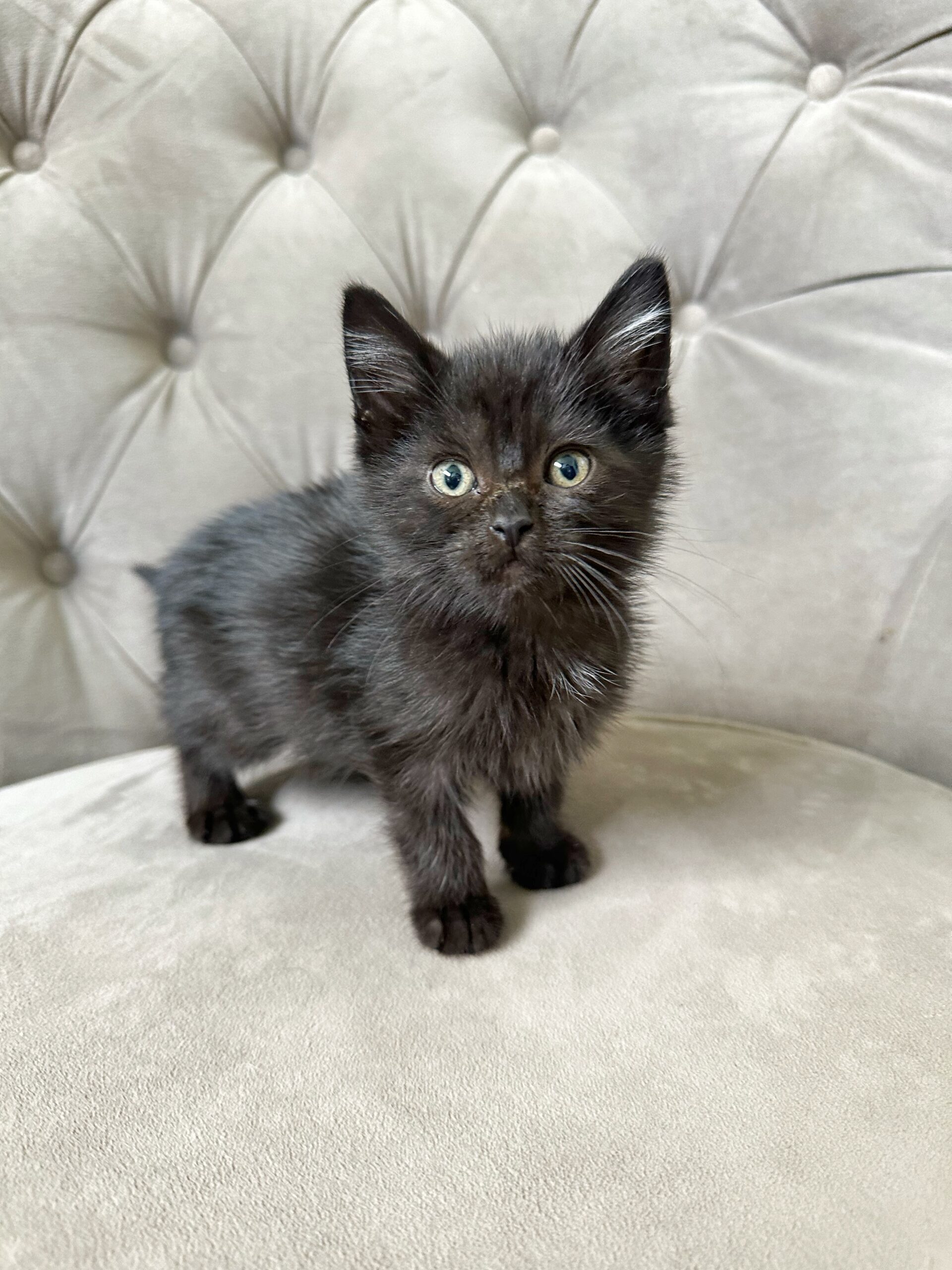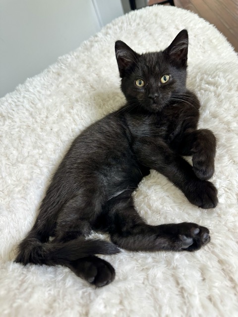 This little “house panther” is as sweet as a country ballad. With his sleek black coat and big golden eyes, Morgan is as handsome as they come. He’s a total lovebug who purrs, cuddles, kneads biscuits, and adores snuggling up with his favorite blanket for a good suckle.