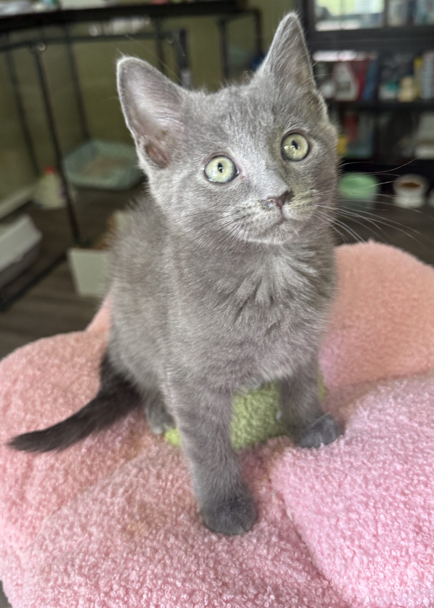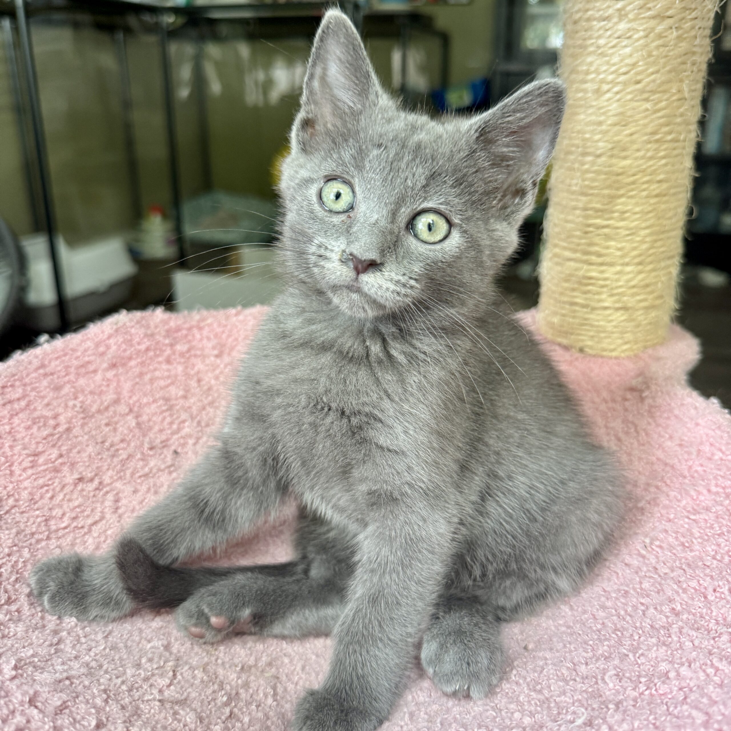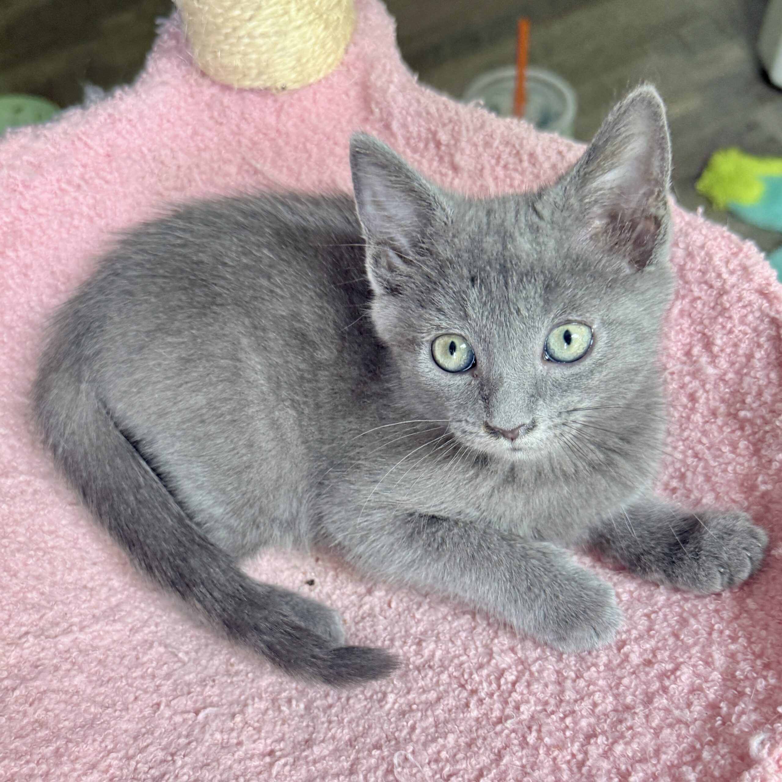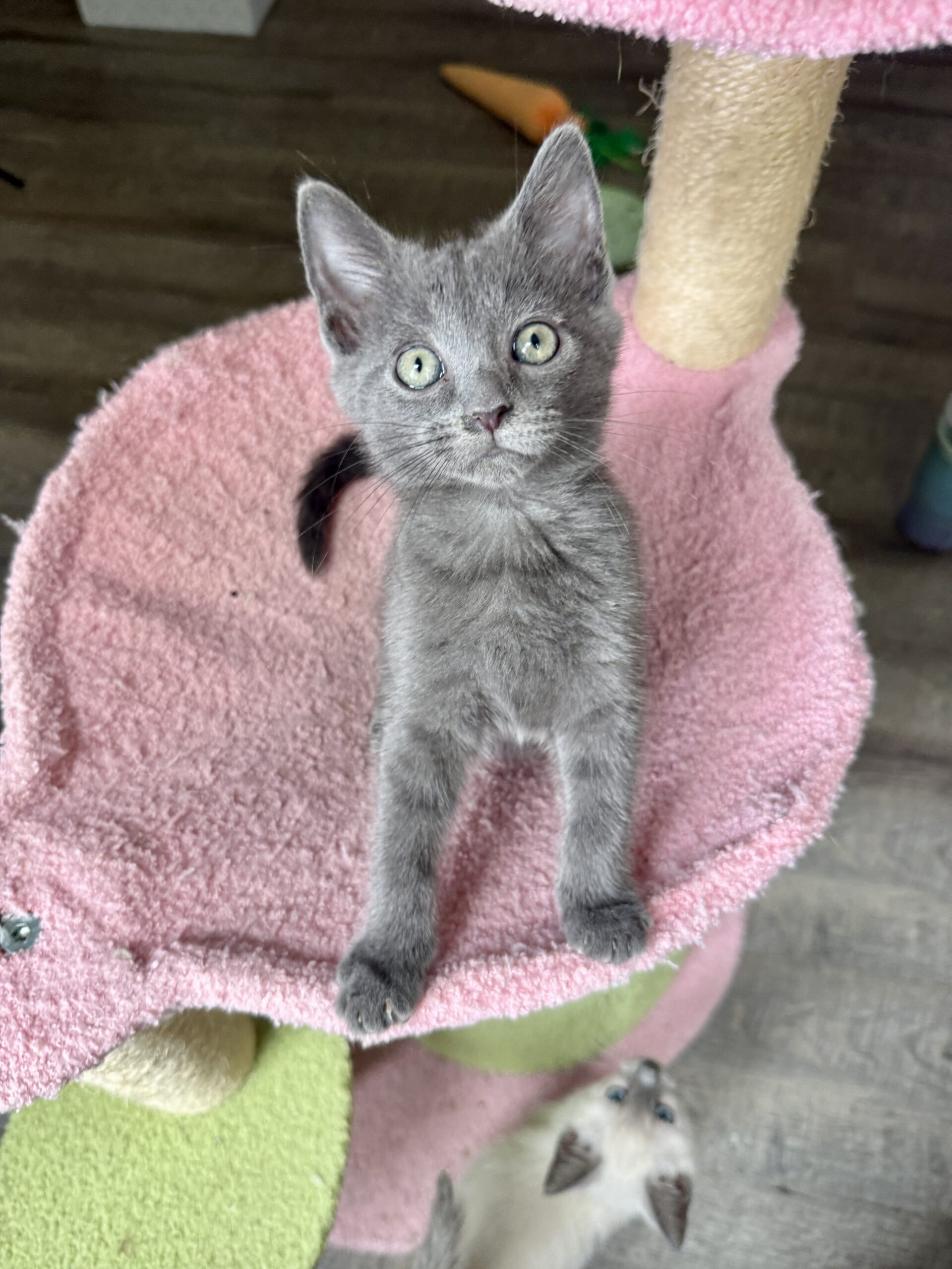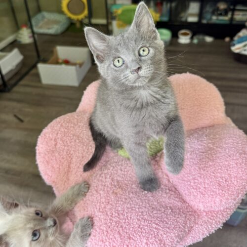 Misty is a beautiful, soft gray kitten with a heart as sweet as her name. Playful and curious, her absolute favorite pastime is chasing balls, darting after them with lightning speed before proudly “catching” her prize. When she’s not in the middle of a game, Misty can almost always be found with her brother, Dewy—the two are inseparable. Whether they’re wrestling, snuggling, or purring side by side, they make the perfect little team.