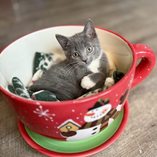 Noelle Nog is a beautiful gray tuxedo kitten with a gentle, loving heart. She’s sweet, affectionate, and especially fond of her littermate Sugarplum—the two are often found cuddling, playing, or napping together. Noelle Nog enjoys her people, gets along well with other cats, and would thrive in a home with a friendly fur companion. She would be an especially wonderful choice for anyone looking to adopt a pair of kittens with Sugarplum.