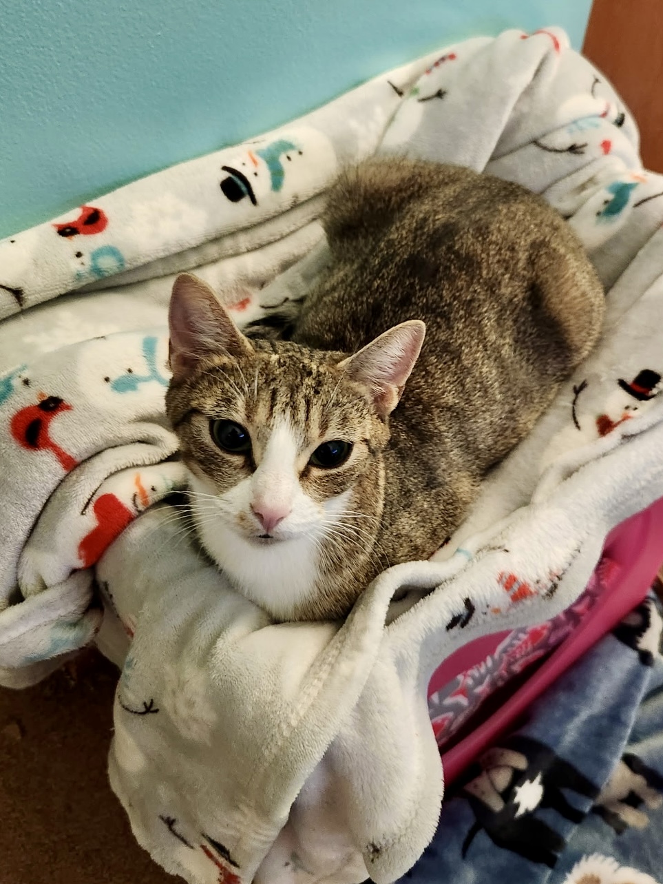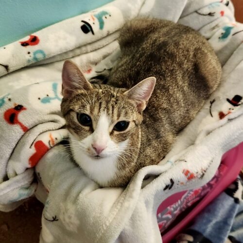 Meet Princess Diana, the regal momma cat who defines grace under pressure! Born July 15, 2024, this elegant lady was rescued from a warehouse while expecting and raised her five royal kittens with love and poise. With her soft tiger-striped coat, mesmerizing eyes, and a purr as soothing as a lullaby, she exudes queenly charm. Now that her royal duties are complete, she’s ready to retire her crown and reign over a cozy forever home.