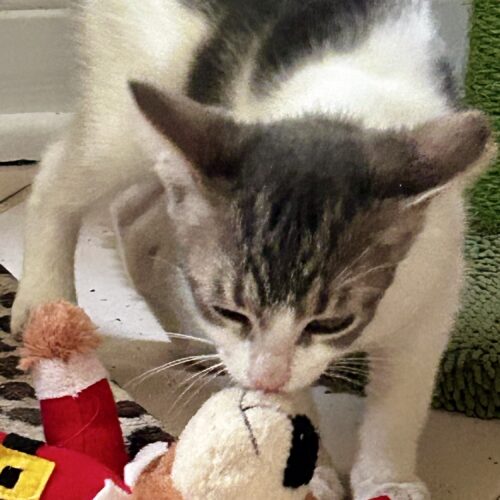 Rigatoni is a super Velcro snuggle bug who wants nothing more than to be close to her people. This gray and white sweetheart, with her adorable bright pink nose, will happily curl up in your lap and soak up all the love and attention she can get. She is the definition of a lovey kitten—gentle, affectionate, and always ready for cuddles. Rigatoni would love to be adopted with her brother, Fettuccine, who is also available through ARPO. Together, they’ll bring double the love, warmth, and companionship to their forever home.
