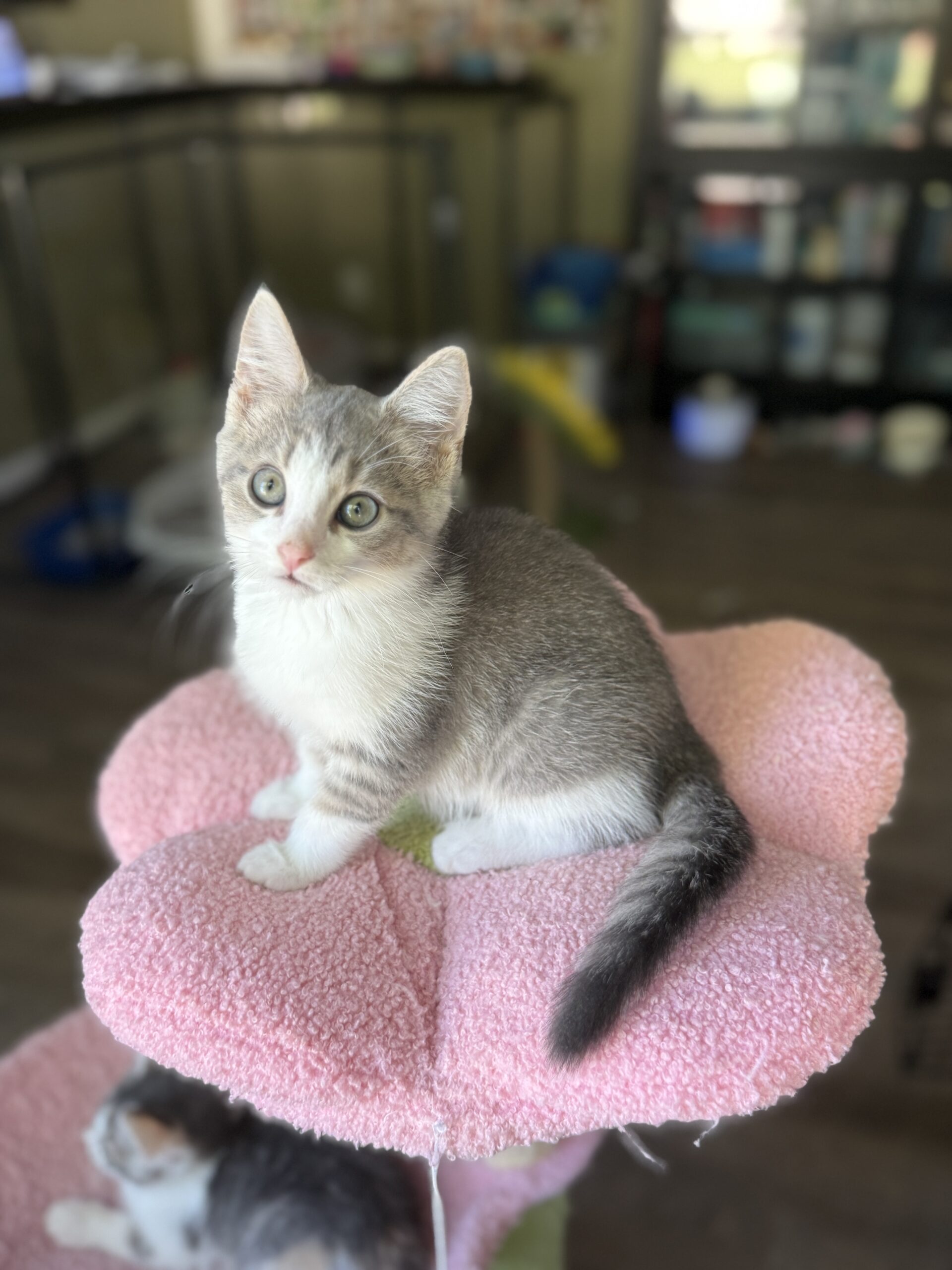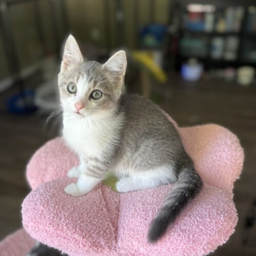 Rossini—better known as Ross—is a striking gray tabby with white, and if you look closely, it looks like hints of ginger on his ears. —he may even be a rare male dilute calico! Ross is as sweet as he is unique, a playful little guy who also loves to snuggle up with his brother Martini (“Marty”) Just like a perfect cocktail, Ross is the right mix of charm, playfulness, and affection.