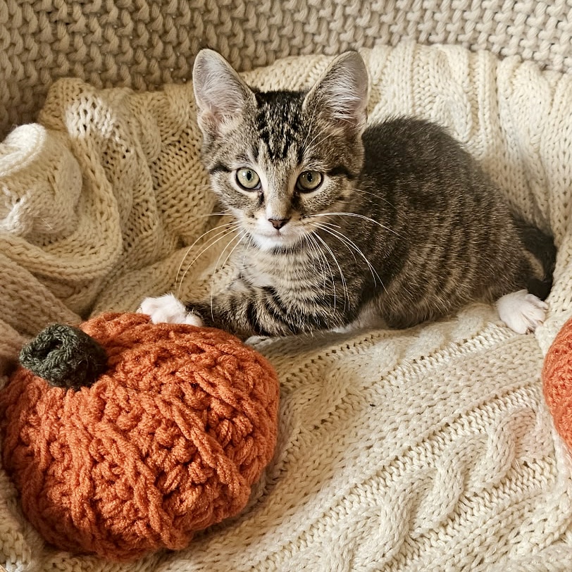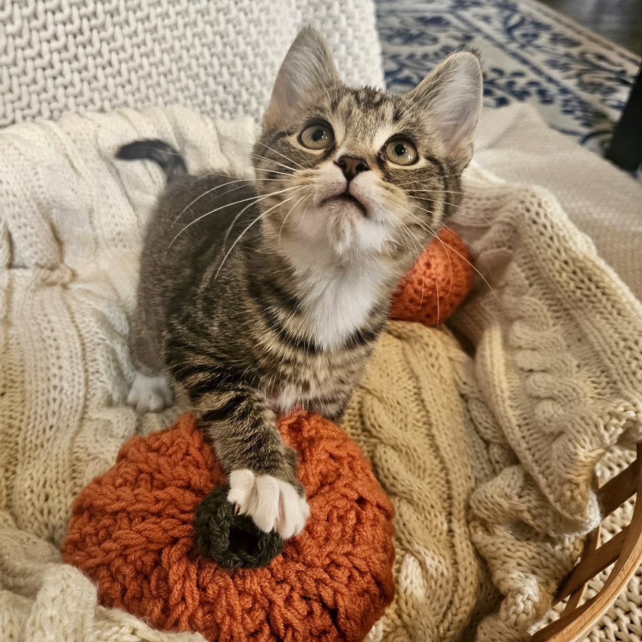 Meet Sweet Potato.  This adorable little girl is as warm and comforting as her name.  Sweet Potato is a playful kitten loves snuggles and exploring her world with wide-eyed wonder.  She's the perfect fall treat soft, Sweet, and ready to be part of your family's holiday tradtions.