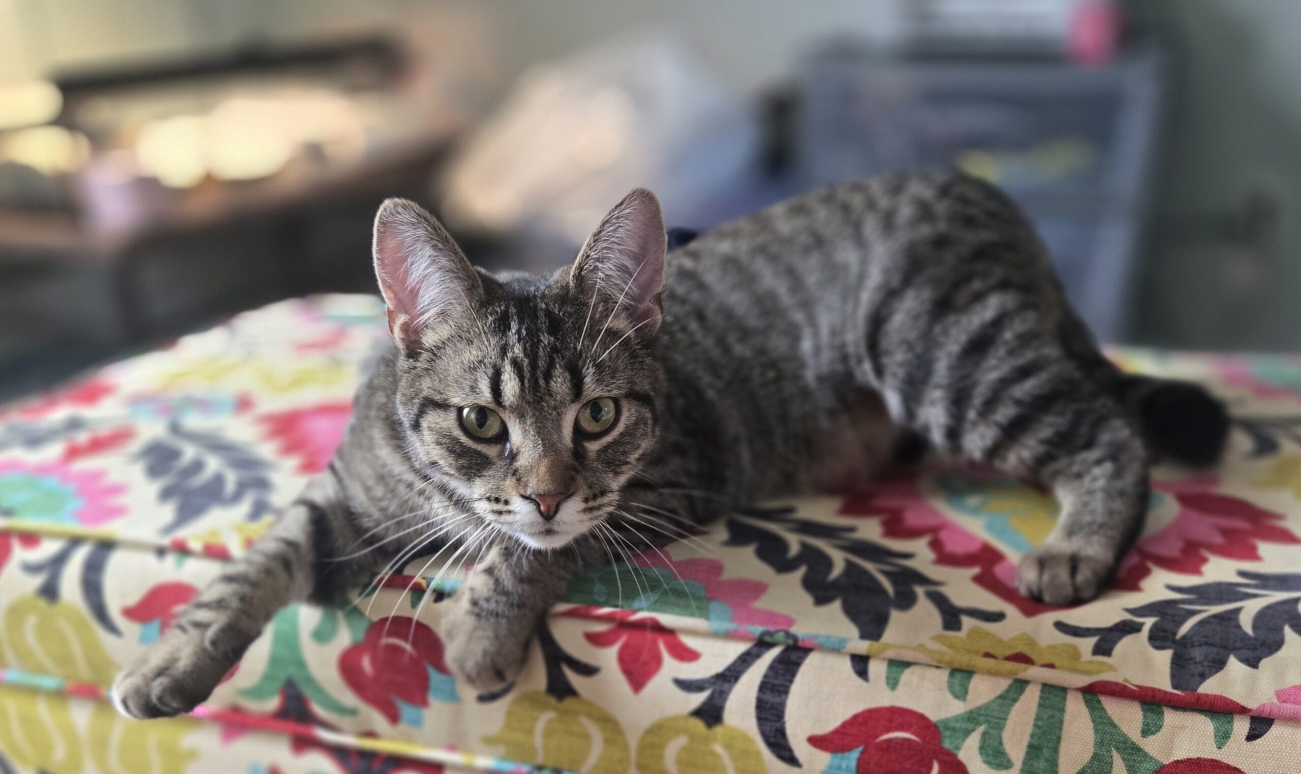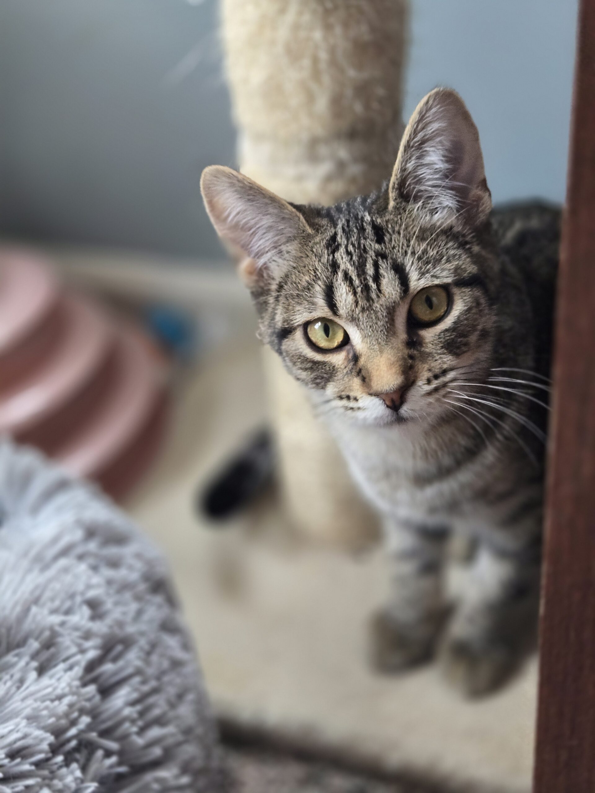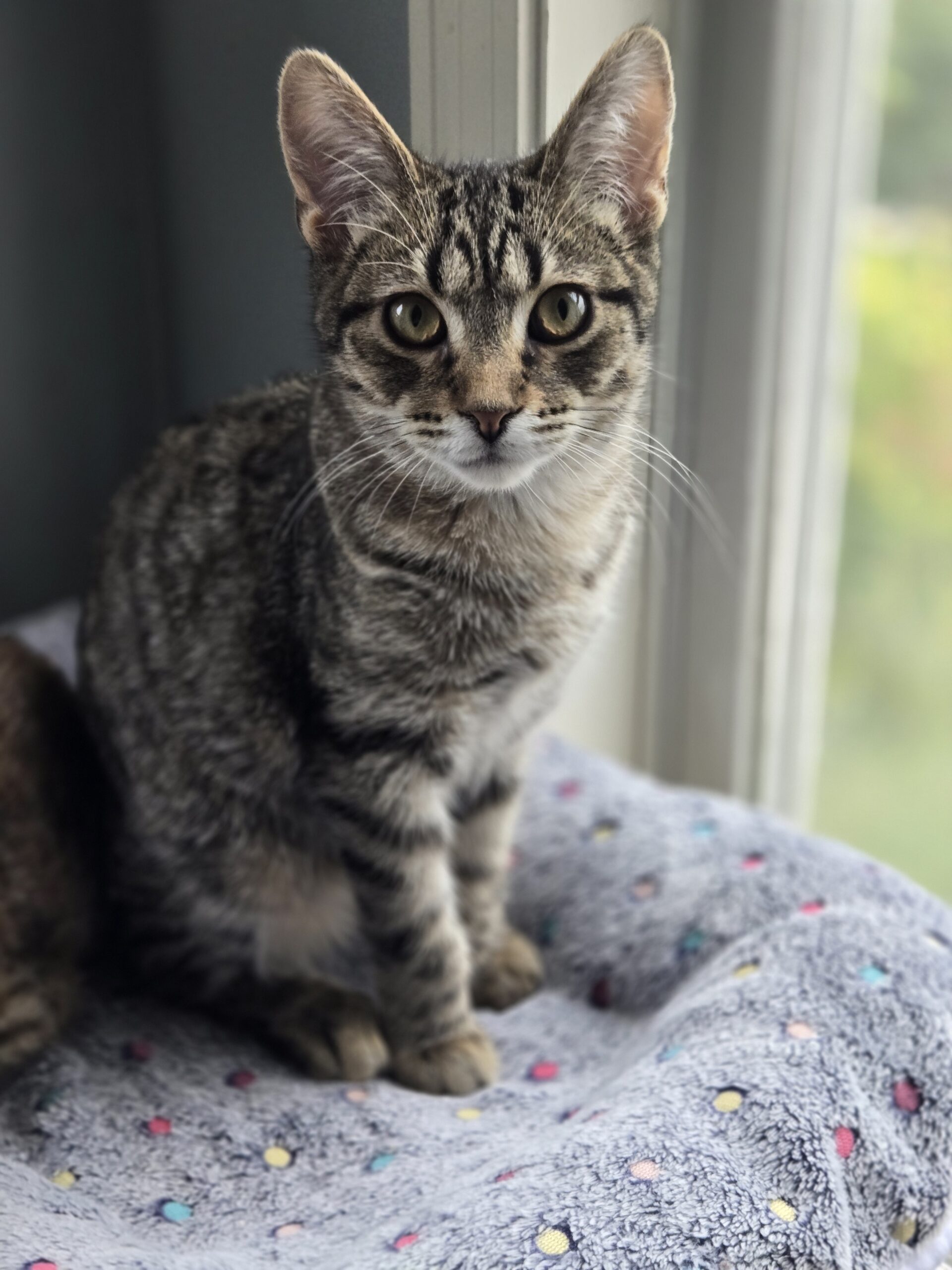 Baby T (short for T. rex) may have a big name, but he’s a gentle, sweet-natured little guy with a heart full of love. This handsome male tabby was born on April 8, 2025, and was lovingly welcomed into Mama Ingrid’s litter of three. Most of his adopted siblings have already gone home, but Baby T is still waiting for his forever family.