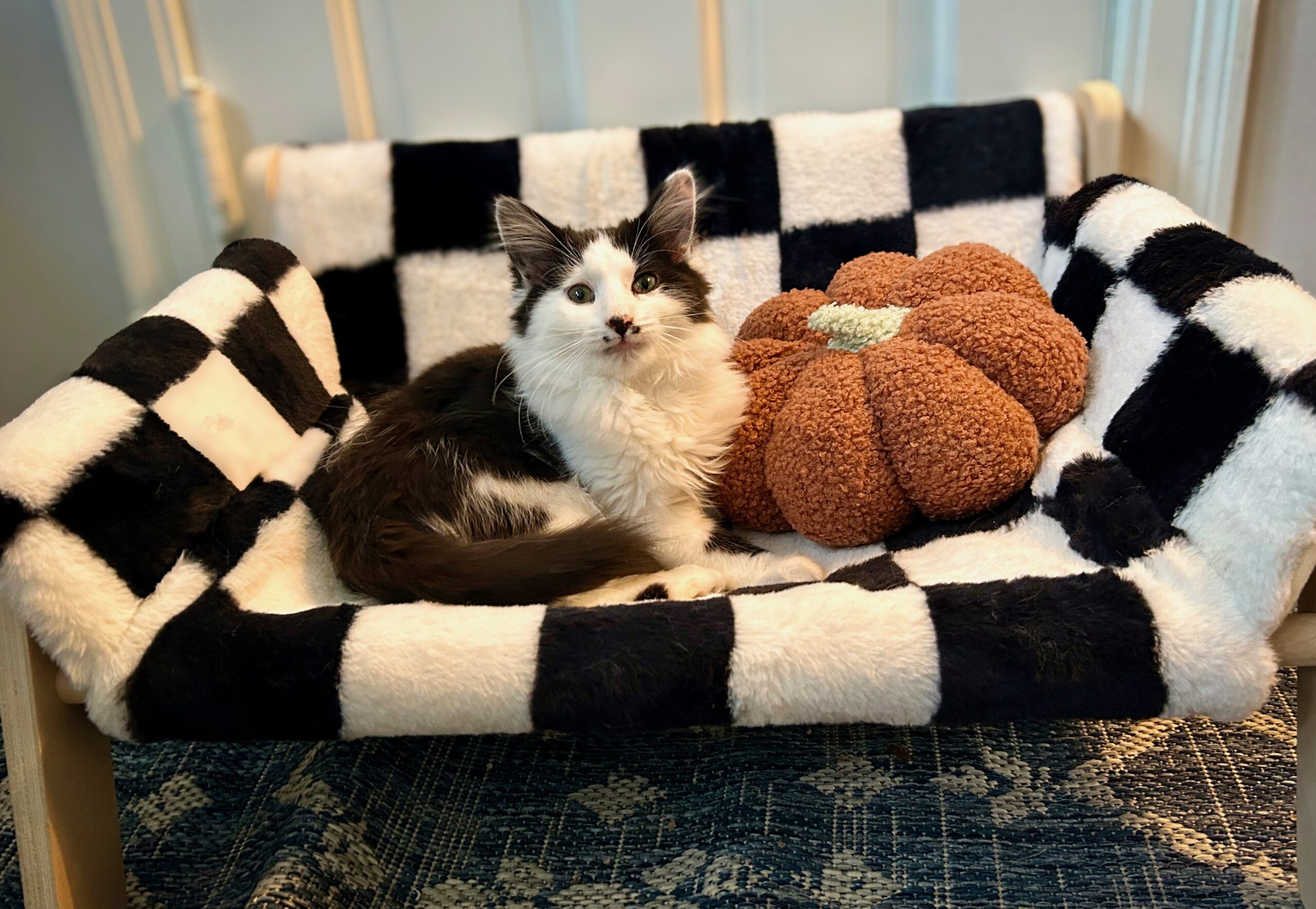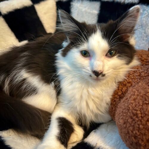 Tilapia is a soft, sweet kitten with beautiful medium-length fur and a quiet charm that makes her truly special. She may start out a bit shy when meeting new people, but with patience and kindness, she blossoms into a friendly, affectionate companion.