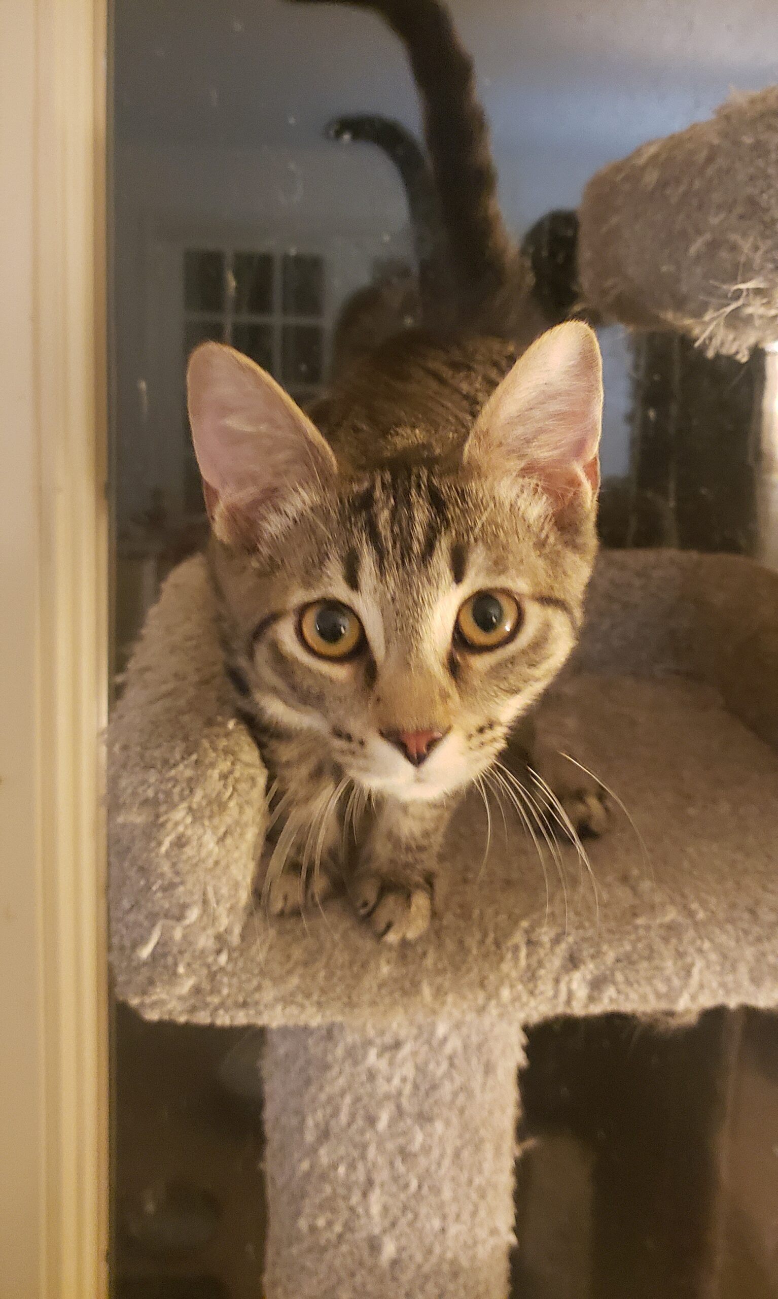 I’m a curious little daredevil who’s always on the move—chasing my tail, scaling the cat tower like a pro, and getting into some good old-fashioned mischief with my siblings (especially my partner-in-crime, Verona). Wrestling matches? Count me in. Feather wand duels? I’m a champ.