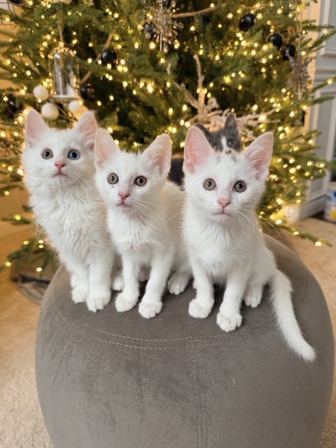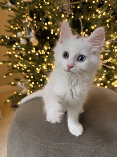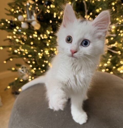 Tootsie Roll is a stunning long-haired white kitten with a truly magical feature: two different colored eyes! This beautiful trait is called heterochromia, and it simply means each of her eyes developed its own unique color. It doesn’t affect her vision or health — it just makes her extra special and completely unforgettable.