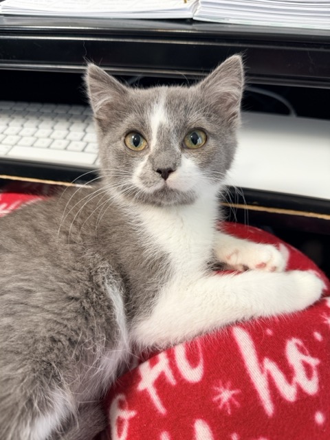 Once the shyest of the trio, Venus now loves her role as her foster mom’s office assistant—purring happily, making biscuits on a warm lap, and supervising the workday. She’s curious about other cats and would thrive with a confident young feline friend, though dogs are still a little scary for her.